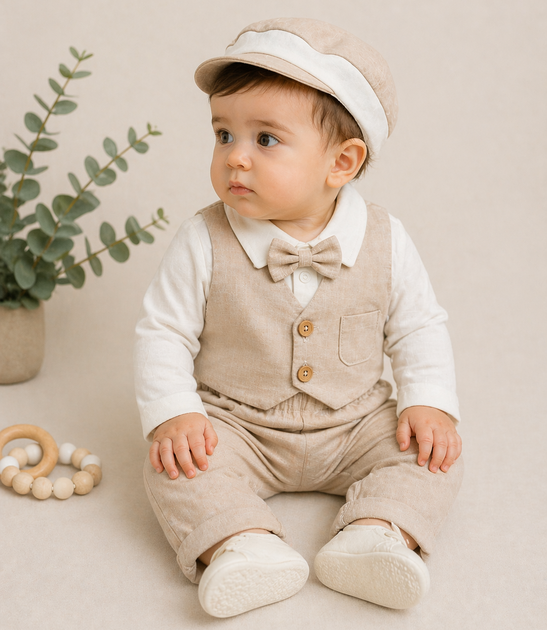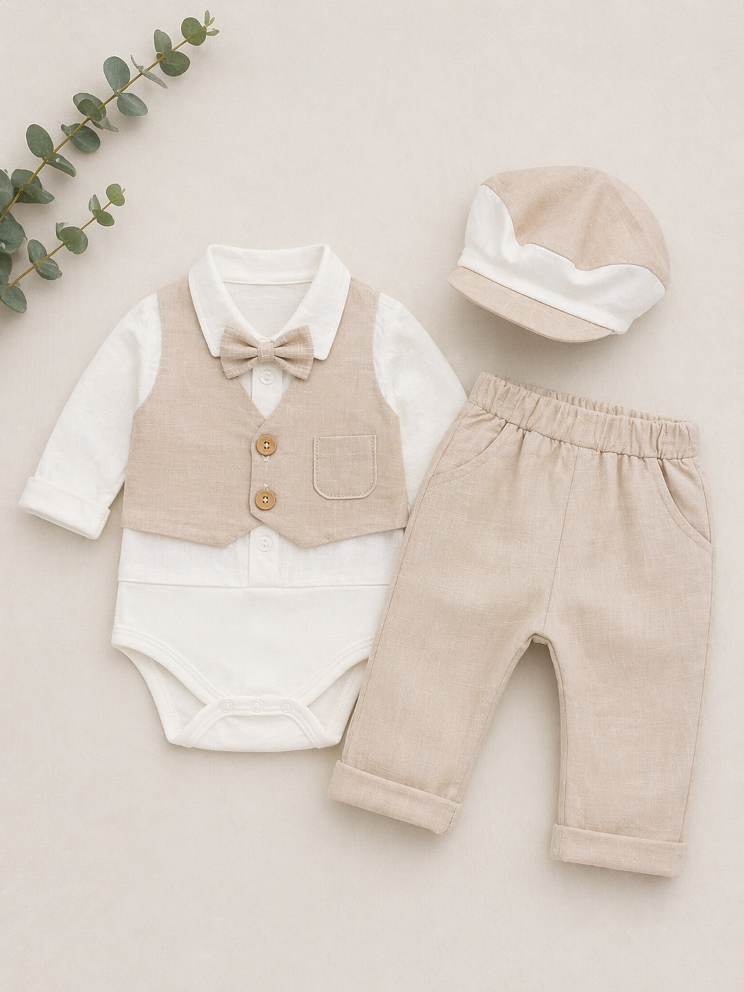 The outfit includes coordinating beige trousers designed with a comfortable elasticated waistband, ensuring a perfect fit for your baby. Completing the look is a matching cap, adding an extra touch of charm and sophistication.