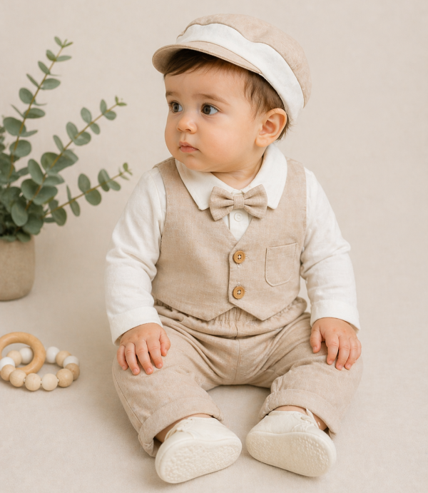 Baby Boys Beige Waistcoat Smart Set with Cap