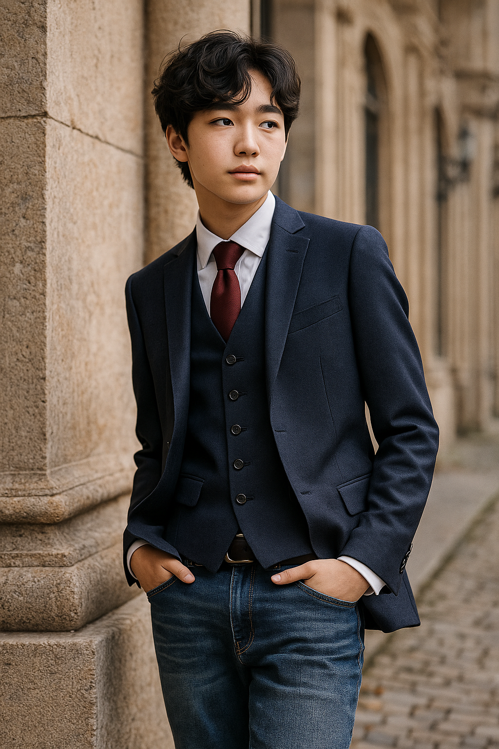 This wonderfully styled suit waistcoat alongside the jacket and a crisp white shirt with the burgundy ties perfect for those looking for a smooth finishing touch.