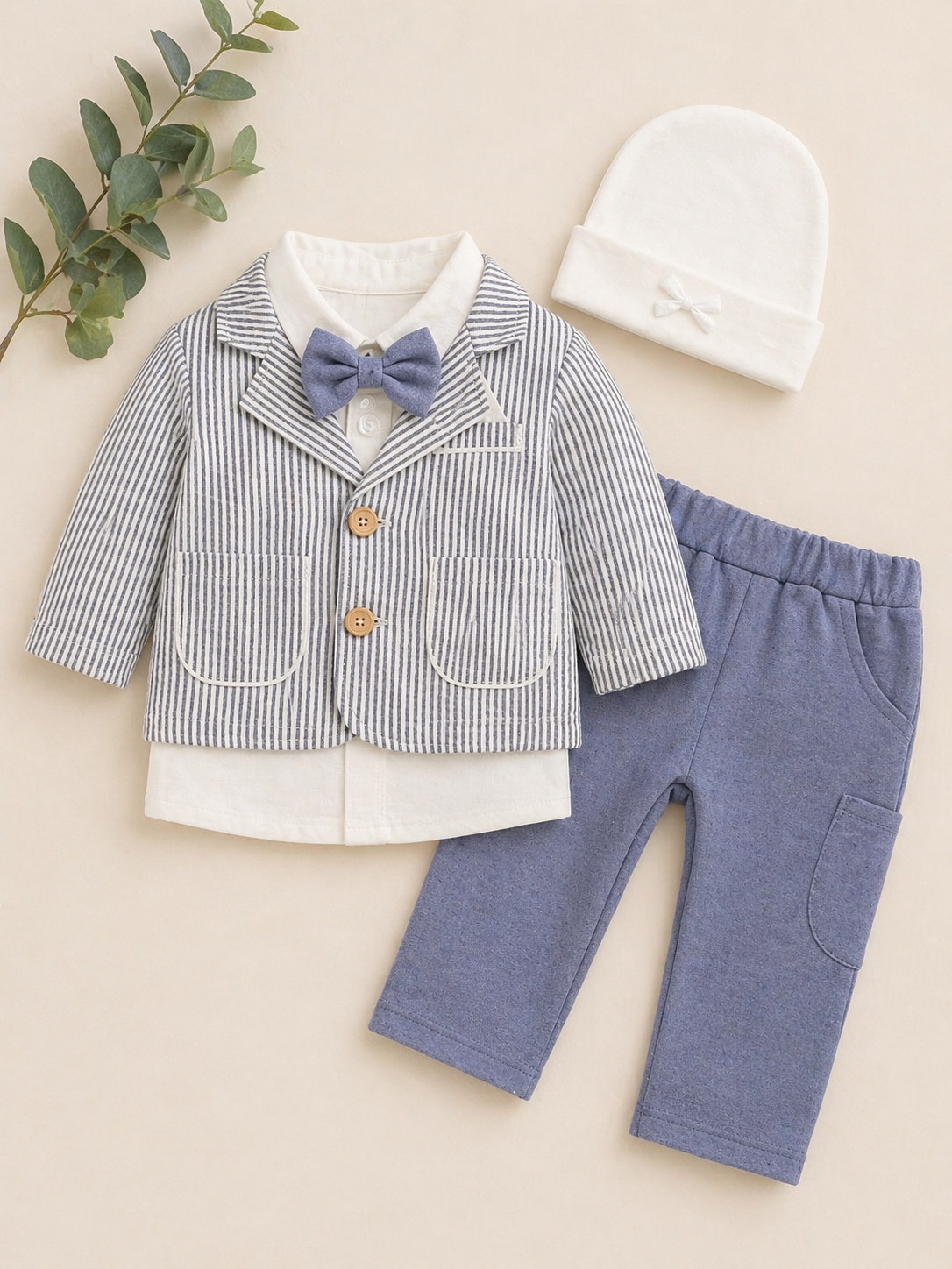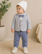 Featuring a soft neutral colour palette, the set includes a lightweight striped blazer with wooden button detailing, a crisp shirt with a coordinating bow tie, comfortable elasticated trousers, and a matching cap for the perfect finishing touch.