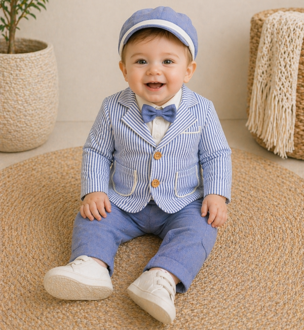 Featuring a soft neutral colour palette, the set includes a lightweight striped blazer with wooden button detailing, a crisp shirt with a coordinating bow tie, comfortable elasticated trousers, and a matching cap for the perfect finishing touch.