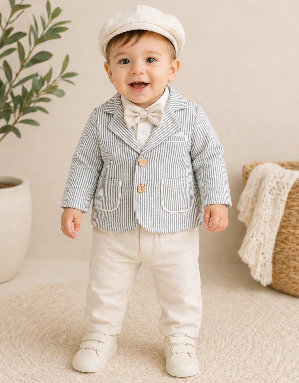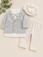 Featuring a soft neutral colour palette, the set includes a lightweight striped blazer with wooden button detailing, a crisp shirt with a coordinating bow tie, comfortable elasticated trousers, and a matching cap for the perfect finishing touch.