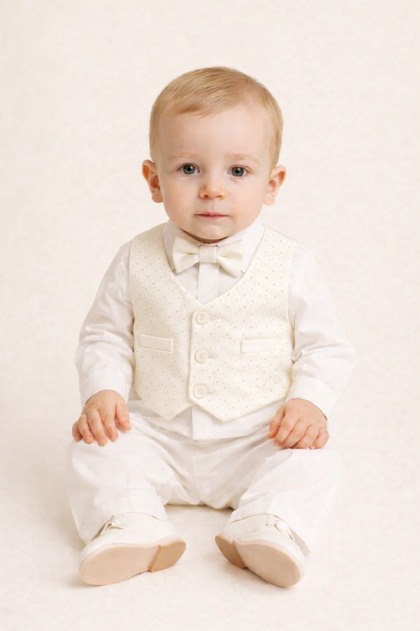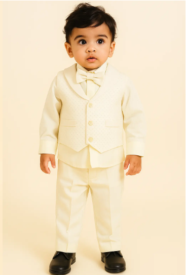 Dress your little one in timeless elegance with this beautifully coordinated 4-piece ivory suit set. Perfect for weddings, christenings, birthdays, and special celebrations, this outfit combines classic tailoring with adorable charm.