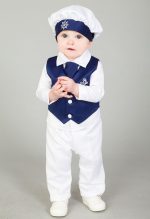 This gorgeously cute 4 piece Christening Sailor Suit is perfectly designed to ensure your baby’s day is a memorable one. Made from 100% Polyester, this christening suit features a pair of white elasticated trousers, a white shirt with full sleeve and collar, a beautiful Navy waistcoat with White embroidery and White buttons, a matching navy cravat and a super adorable white hat with navy embroidery.