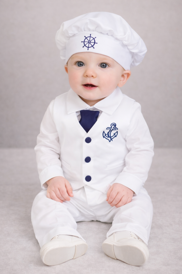 This gorgeously cute 4 piece Christening Sailor Suit is perfectly designed to ensure your baby’s day is a memorable one. Made from 100% Polyester, this christening suit features a pair of white elasticated trousers, a white shirt with full sleeve and collar, a beautiful white waistcoat with navy embroidery and navy buttons, a matching navy cravat and a super adorable white hat with navy embroidery.