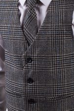This Stylish Navy suit is incredibly eye catching with its Chequered Waistcoat and matching tie. The design of the waistcoat has various lines of grey and blue tinsel which makes this waistcoat the dominant piece of the suit. Subtle hints of blue running throughout the pattern compliment the navy jacket and trousers. The whole suit is finished off with a crisp white shirt