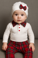 The outfit is completed with a matching white hat, beautifully adorned with a tartan bow, adding the sweetest touch to this perfectly coordinated set.