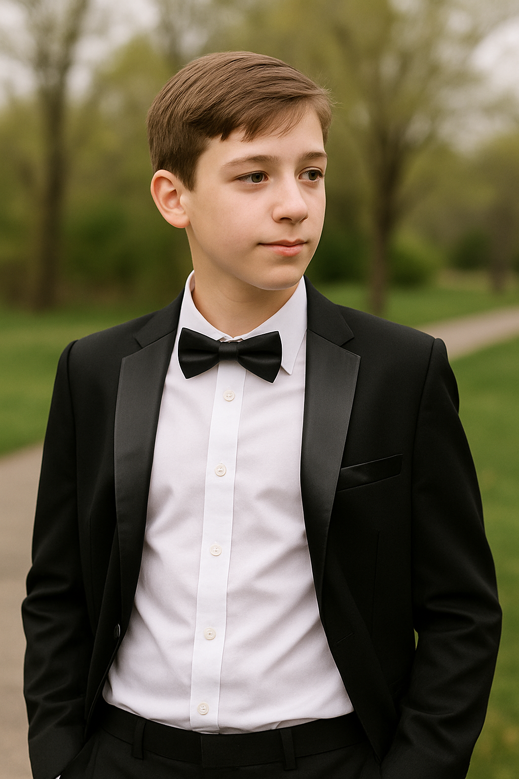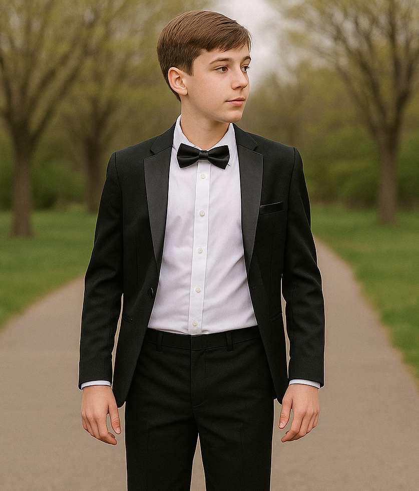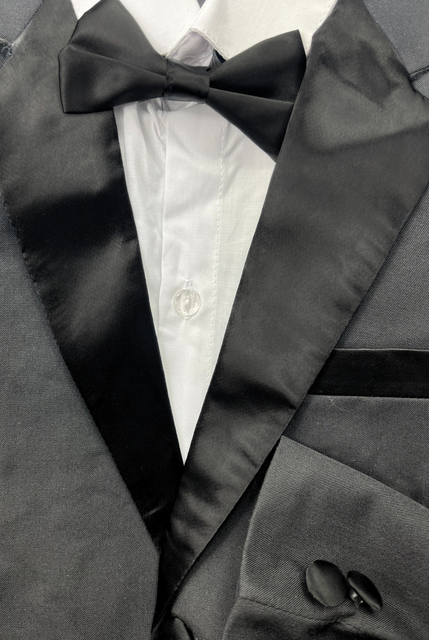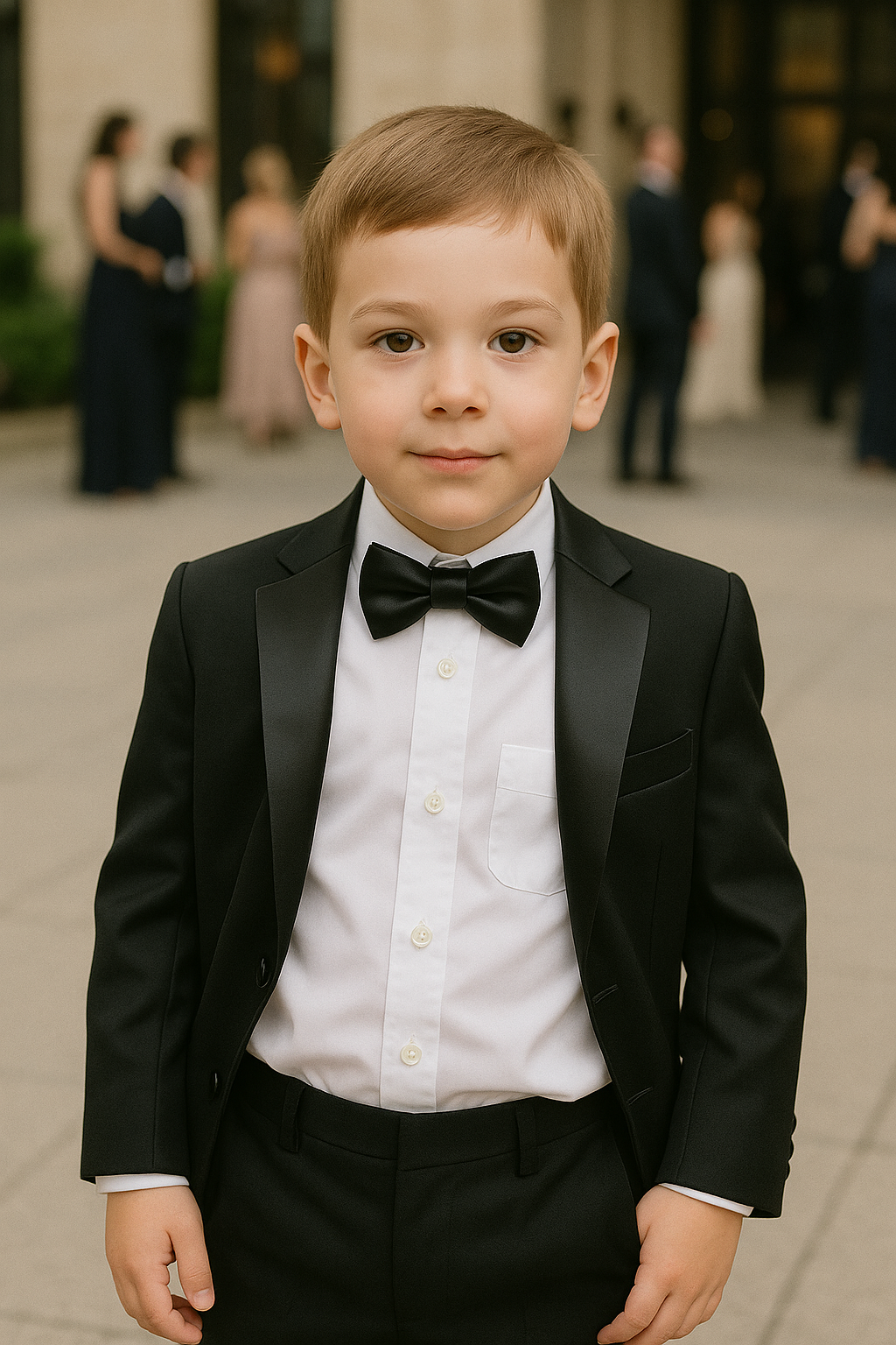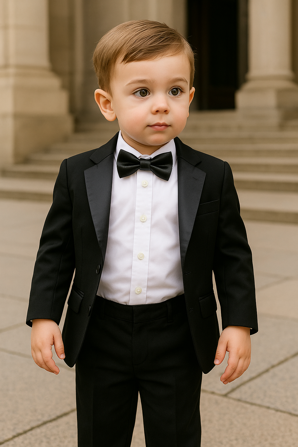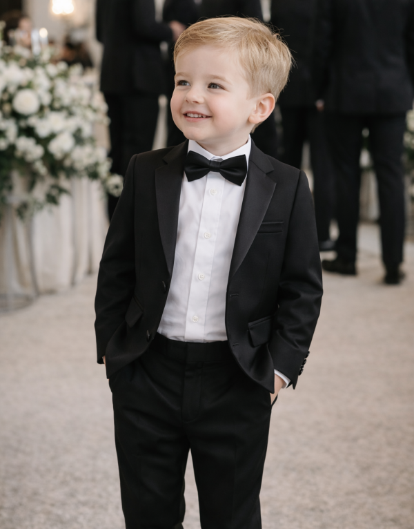 Dress him sharp for every special occasion with our boys’ black tuxedo suit – perfectly tailored, sleek, and comfortable enough for all-day wear. Featuring a classic jacket, matching trousers, a white shirt and bow tie to complete the look. With smart details, it’s ideal for weddings, parties, school events, and formal photos. Timeless style, grown-up look, kid-friendly fit. Dress him in a tux that makes him feel confident and look unforgettable.