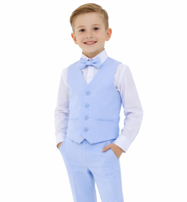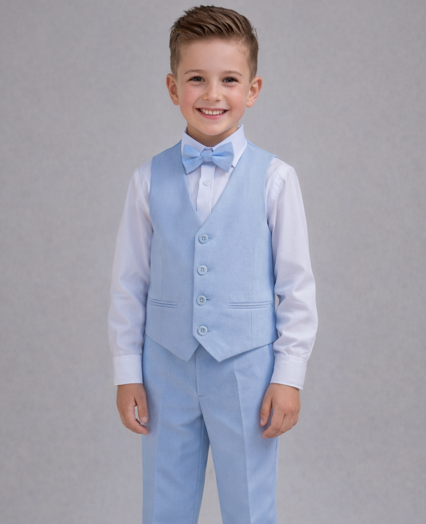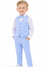 This pale blue suit offers a crisp, tailored look with a button-up shirt, coordinating trousers, and a matching waistcoat. The pale blue bow tie completes the ensemble, combining style and comfort for any formal occasion. A timeless choice for your little one to look smart and stylish.