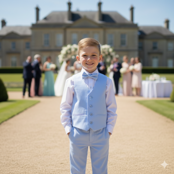 - Waistcoat: Matching pale blue waistcoat for a coordinated style.