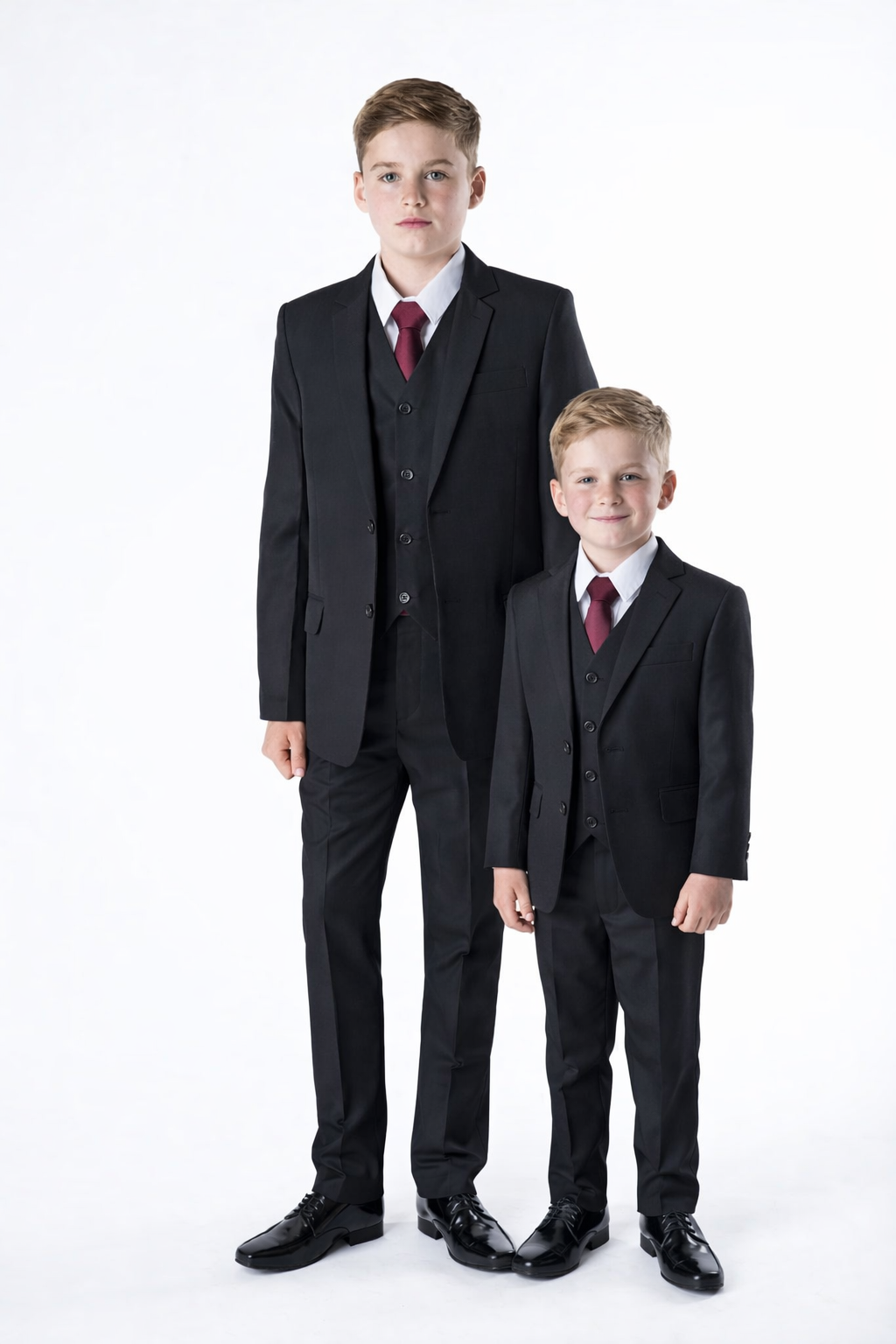 This suit is complete with a slick 2 button black suit jacket, a matching fully lined black waistcoat with an adjustable clasp for sizing, a white full sleeved collar shirt, black elasticated trousers and a matching plain burgundy tie for that final touch
