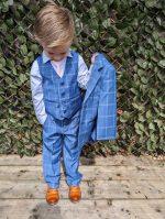 Lockdown the look in this super stylish boys 5 piece blue check suit. The crisp white shirt and light pink tie contrast flawlessly with the bright blue suit colouring creating the perfect stand out outfit.