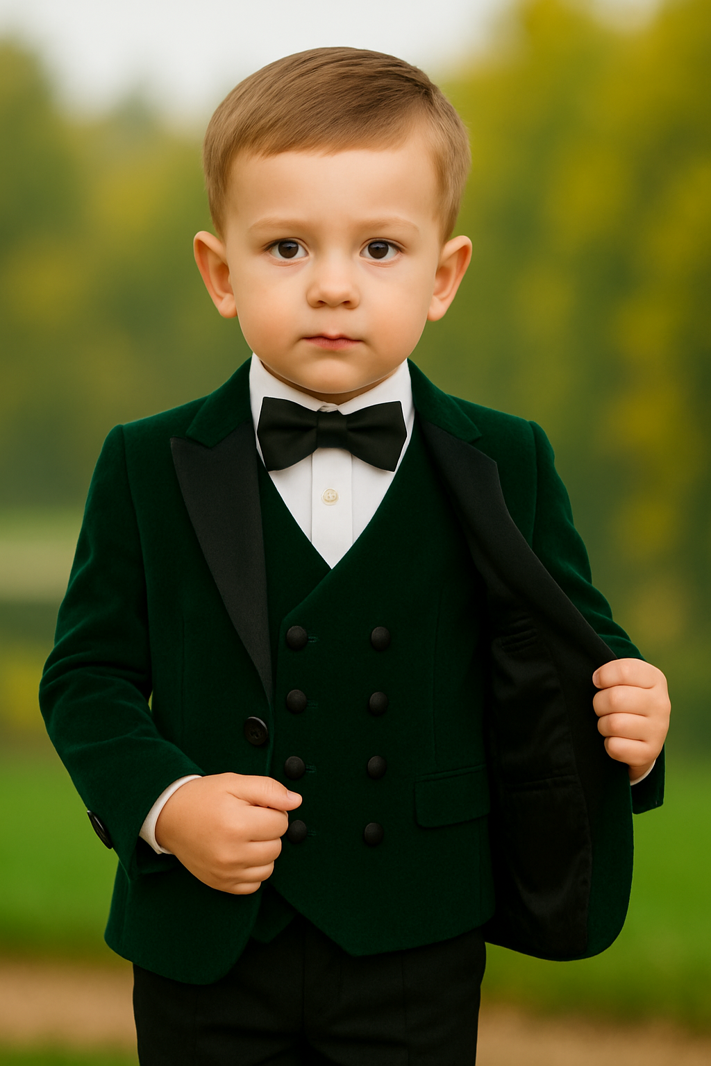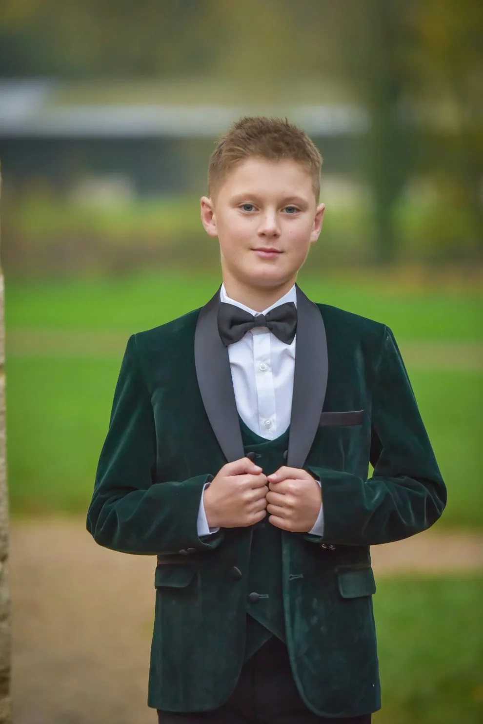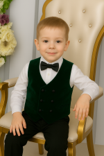 A premium luxury suit by designers Milano Mayfair. This complete 5 piece slim fit suit comes with a 2 Velvet Button Jacket, trousers with adjustable waist, matching 4 button waistcoat, crisp white shirt and a bow tie to complement the suit. Make your little gent look stunning and make every moment memorable with this suit. This premium suit comes in a Milano Mayfair suit bag & Free Lint Roller
