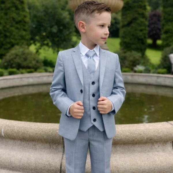 The most perfect summer suit, a premium luxury outfit by designers Milano Mayfair. This complete 5 piece slim fit suit comes with a 2 Button Jacket, trousers with adjustable waist, matching 4 button waistcoat, crisp white shirt and a tie to complement the suit. Make your little gent look stunning and make every moment memorable with this suit. This premium suit comes in a Milano Mayfair suit bag.
