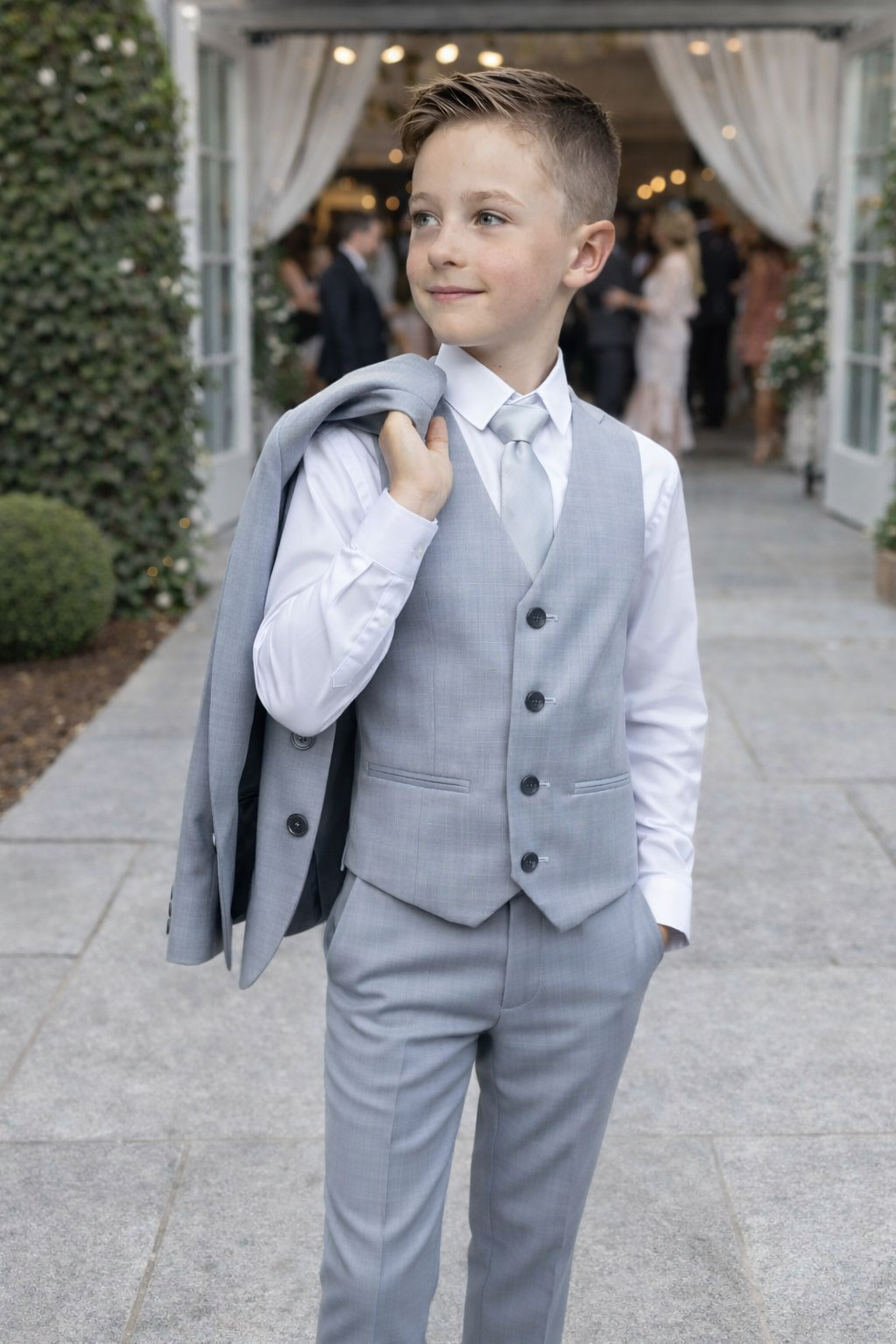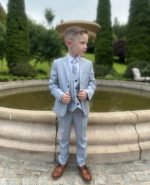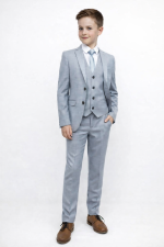 The most perfect summer suit, a premium luxury outfit by designers Milano Mayfair. This complete 5 piece slim fit suit comes with a 2 Button Jacket, trousers with adjustable waist, matching 4 button waistcoat, crisp white shirt and a tie to complement the suit. Make your little gent look stunning and make every moment memorable with this suit. This premium suit comes in a Milano Mayfair suit bag.