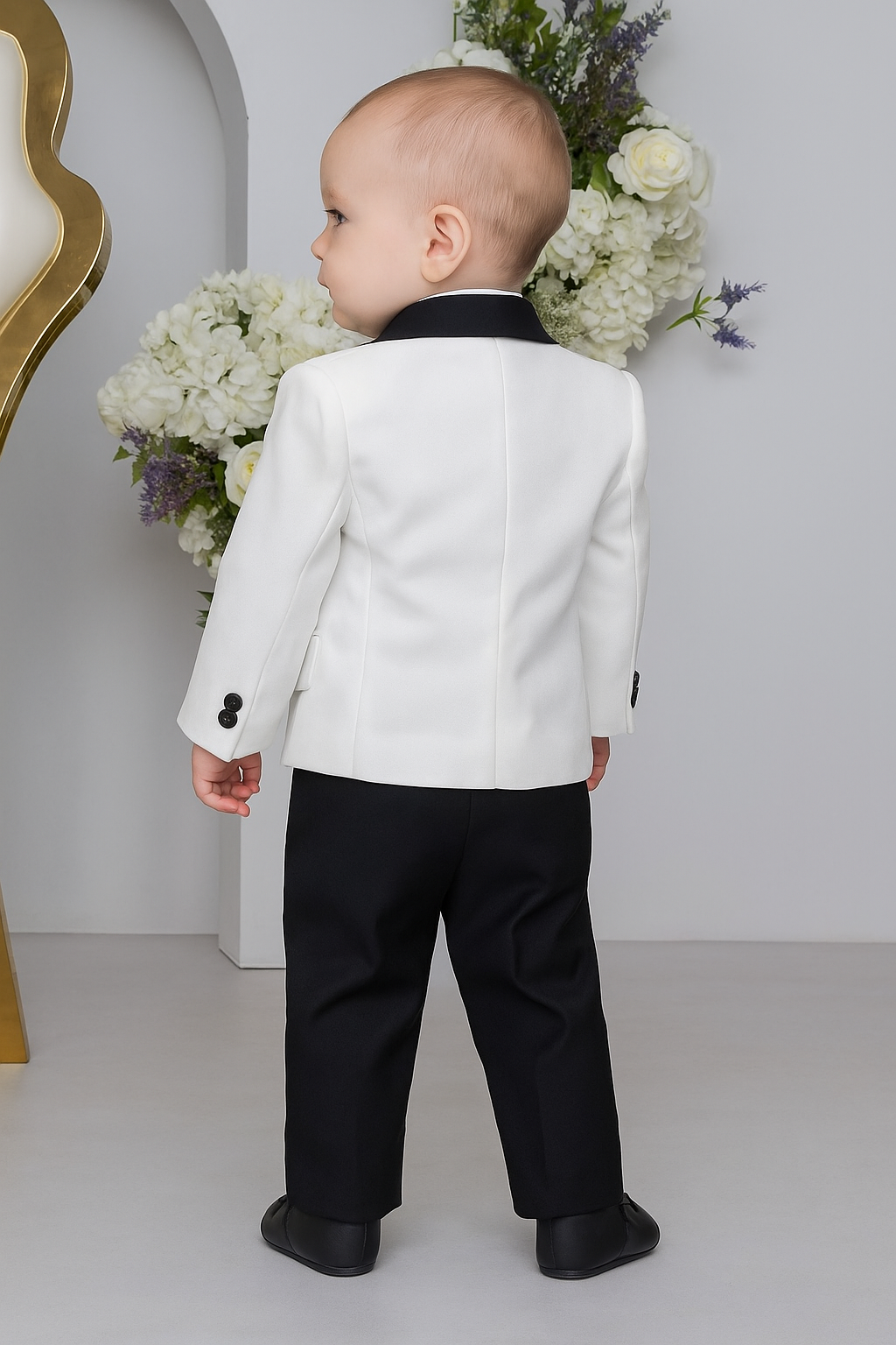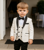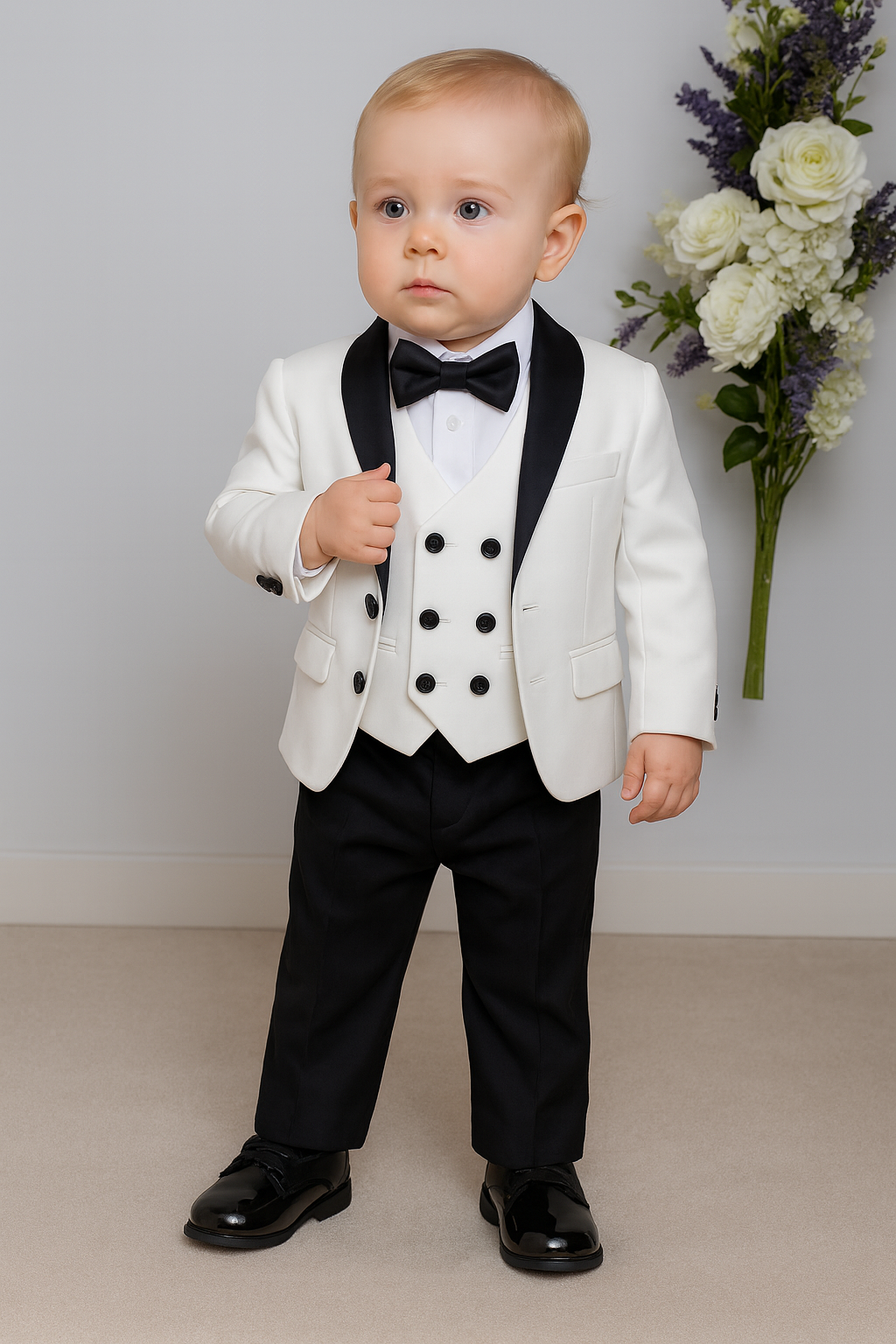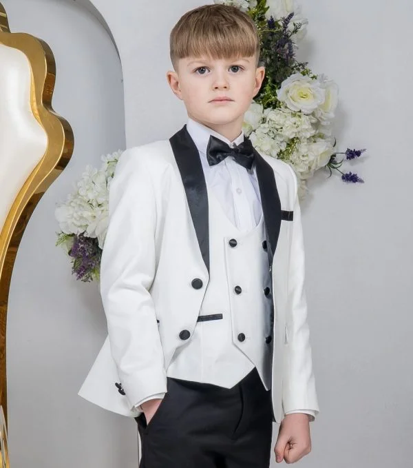 A premium luxury suit by designers Milano Mayfair. This complete 5 piece slim fit suit comes with a 2 White Button Jacket, trousers with adjustable waist, matching 4 button waistcoat, crisp white shirt and a bow tie to complement the suit. Make your little gent look stunning and make every moment memorable with this suit. This premium suit comes in a Milano Mayfair suit bag.
