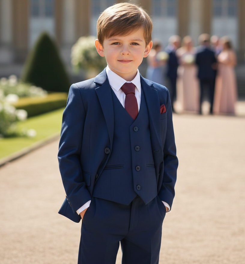 Look sharp in our premium 5 piece Navy suit. A sleek slim fit in a rich blue colouring which is complimented with a maroon tie and pocket square. Styled with a crisp white shirt to complete the look.  A wardrobe essential for your child.