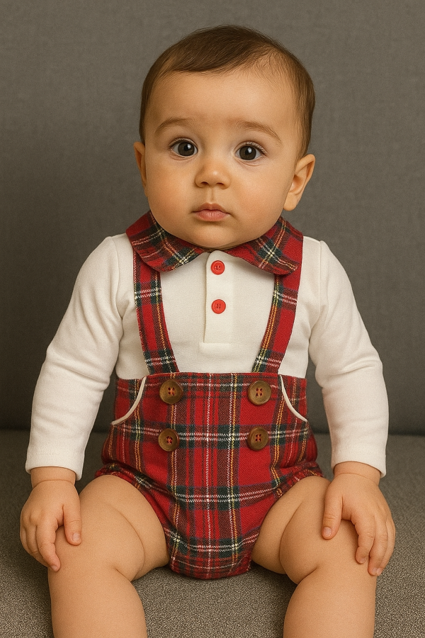 This Vivaki Red Tartan Suspender Baby Romper is a festive favourite designed for little ones who love to dress in style and comfort. Perfect for Christmas gatherings, parties, or special photoshoots, this adorable romper brings together traditional charm and modern elegance.