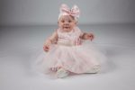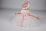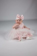 With a floral patterned bodice and a pearl beaded waistline, followed by a layered tulle skirt.