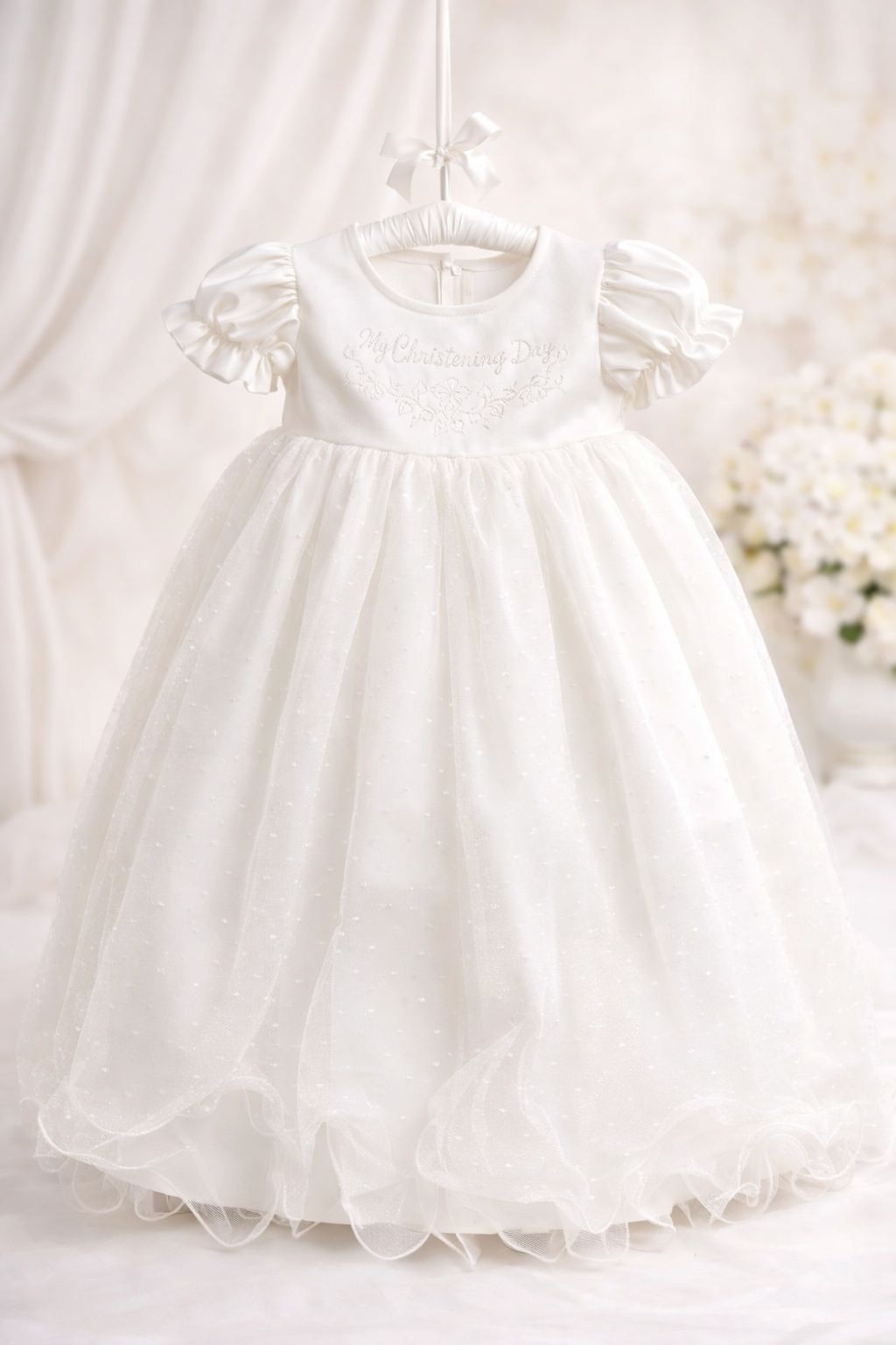 - Bodice: The bodice is embroidered with “My Christening Day,” adding a sentimental touch to the gown.