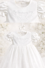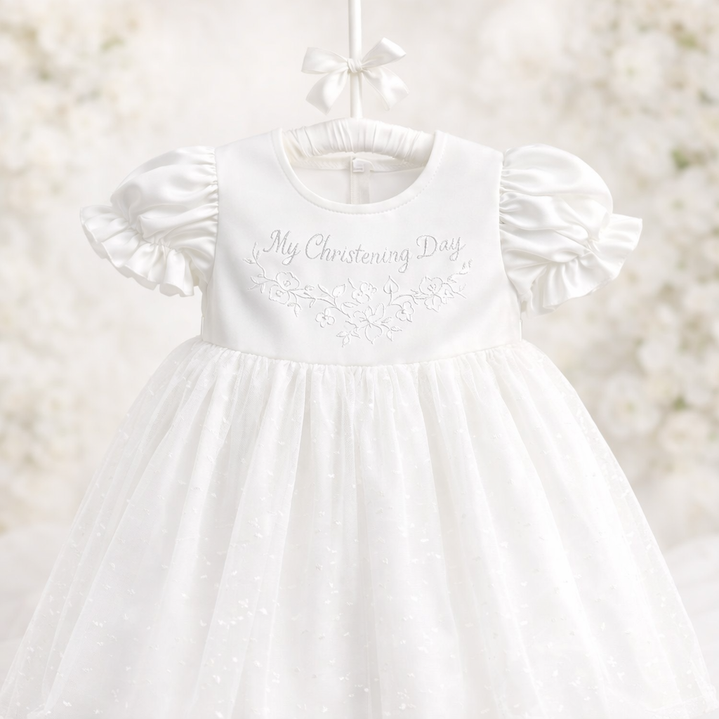 - Bodice: The bodice features the “My Christening Day” embroidery, adding a special touch to this beautiful gown.