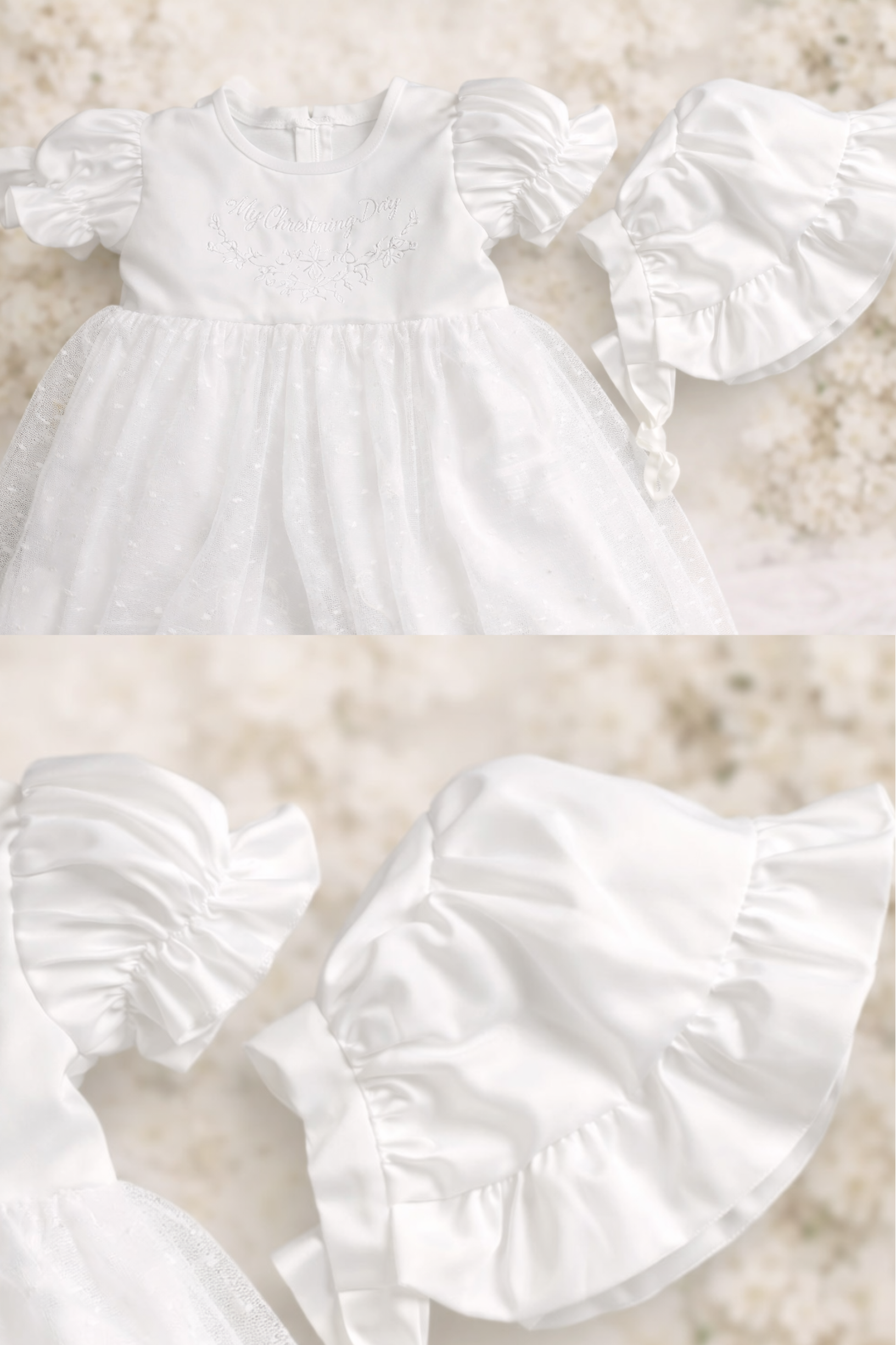 - Bonnet: A matching bonnet is included, perfectly complementing the dress.