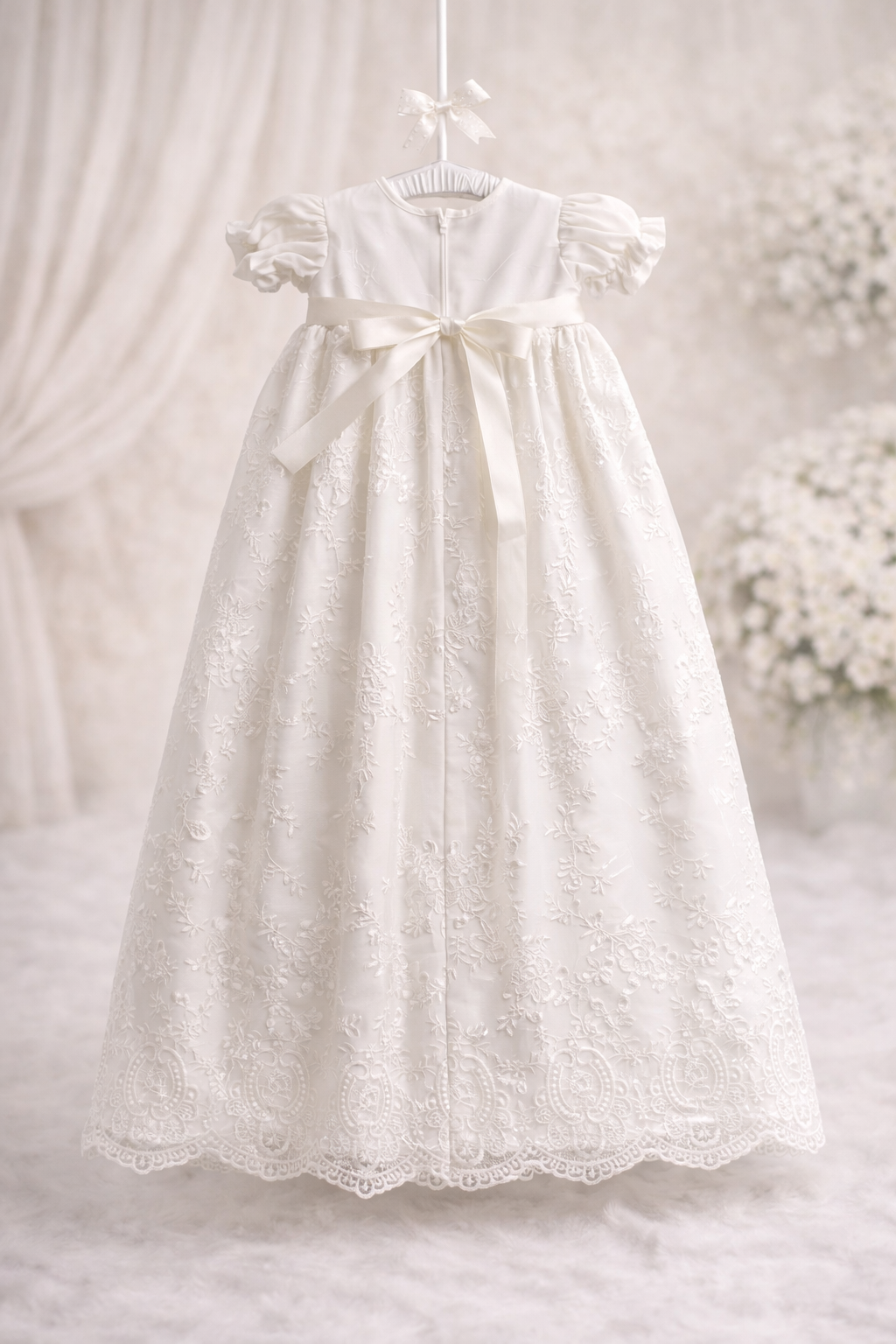 - Overall Look: The floral lace, puffed sleeves, and lace-detailed hem combine to create an elegant, timeless look that is perfect for christenings, baptisms, or any special formal occasion.