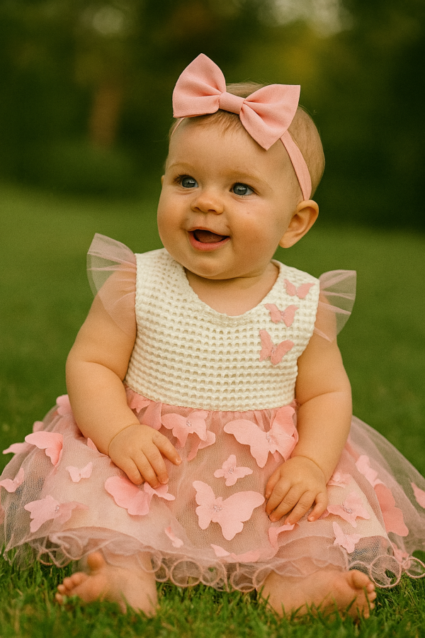 The skirt is made from soft layered tulle in a gentle pink shade, giving it a full and floaty silhouette that moves beautifully as your little one plays or sits. Fully lined for comfort, this dress is perfect for birthdays, family photos, summer parties, and celebrations where a cute and memorable outfit is needed