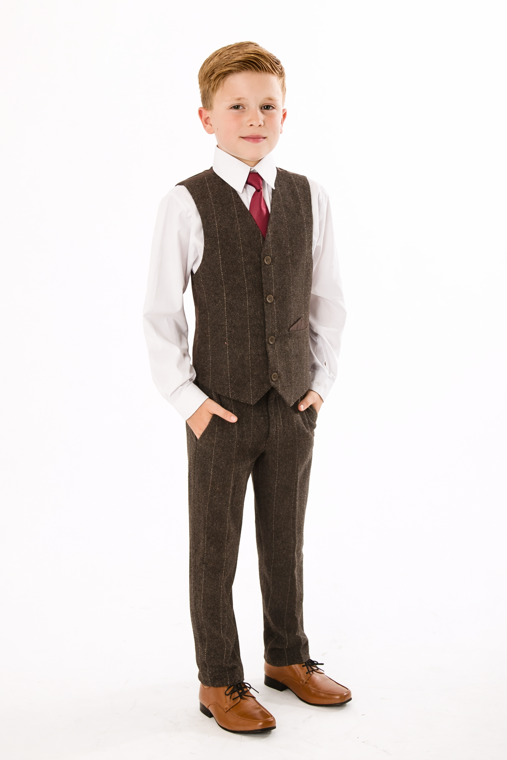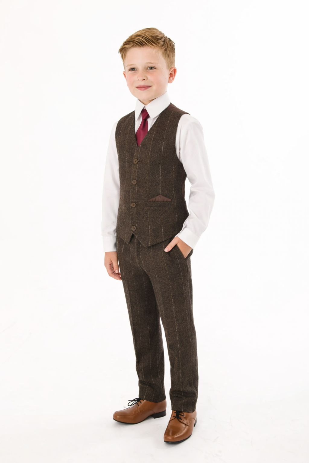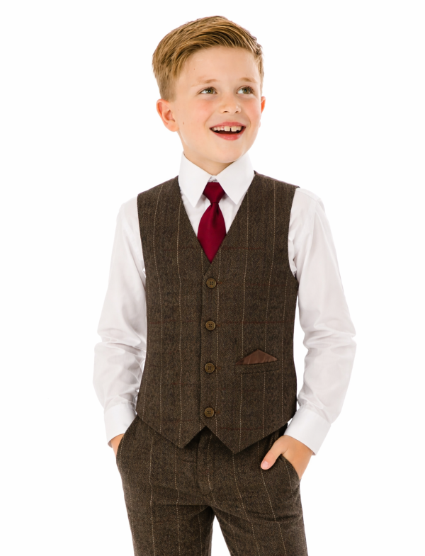 A super stylish Brown check tweed suit, perfect to transform your little boy into a stylish gentleman. This high quality stylish suit consists of a fitted waistcoat and trousers in a stylish Brown tweed with subtle check detailing. A crisp White shirt and Burgundy tie complete the gentleman look.
