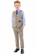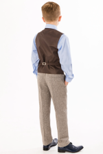 A super stylish Brown herringbone tweed suit, perfect to transform your little boy into a stylish gentleman. This high quality stylish suit consists of a fitted waistcoat and trousers in a stylish Brown herringbone tweed. A crisp Blue shirt and Blue tie complete the gentleman look.