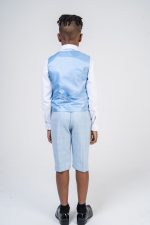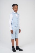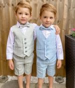 This smart blue check suit comes complete with shorts, waistcoat, shirt and a bow tie. Perfect for any occasion.