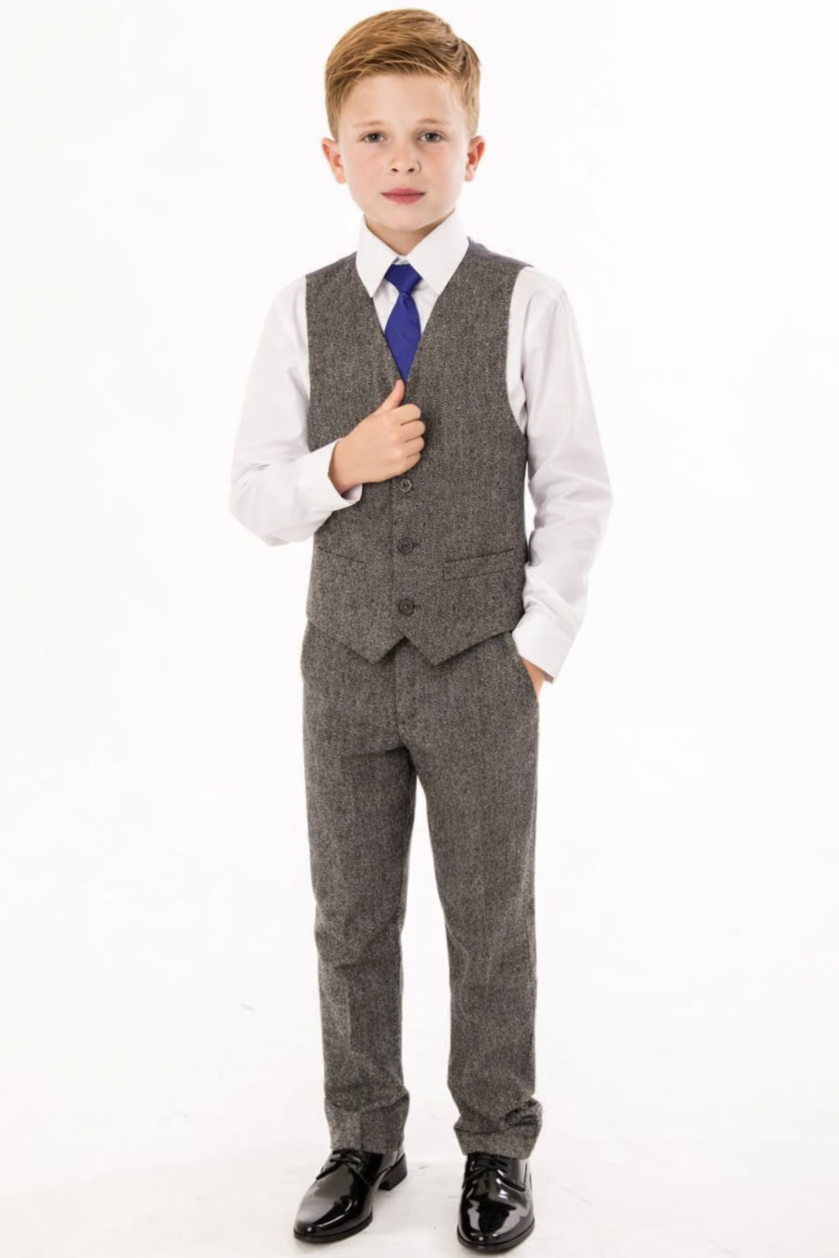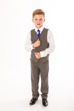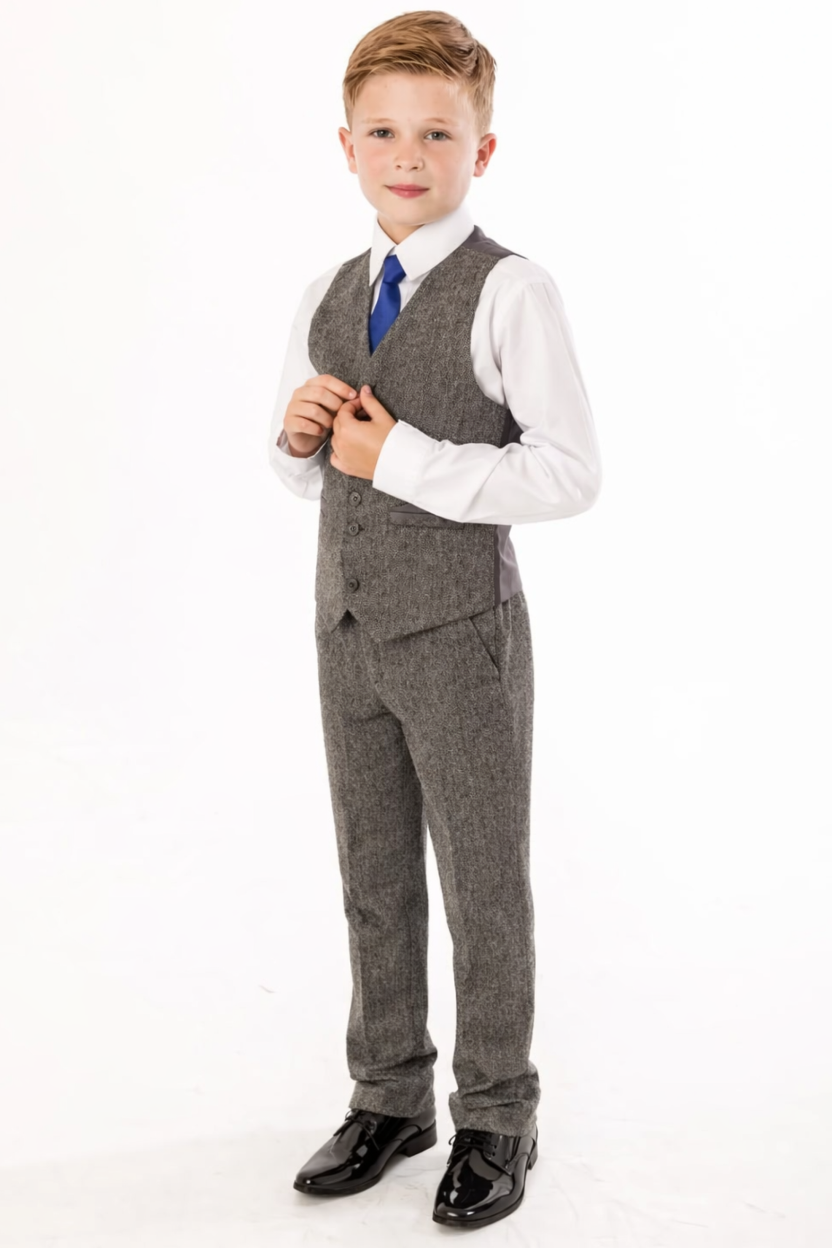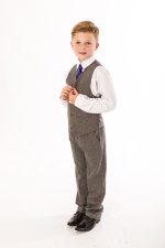 A super stylish Grey herringbone tweed suit, perfect to transform your little boy into a stylish gentleman. This high quality stylish suit consists of a fitted waistcoat and trousers in a stylish Grey herringbone tweed. A crisp White shirt and Blue tie complete the gentleman look.