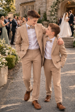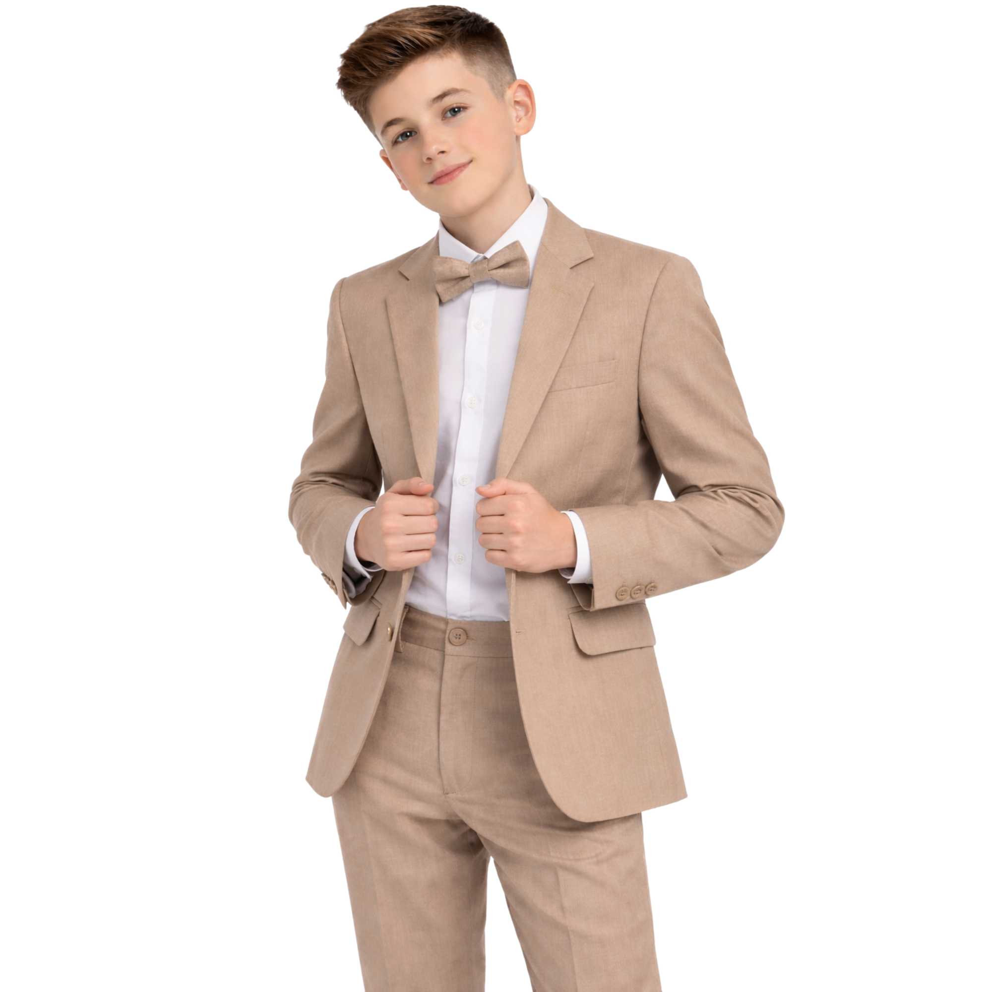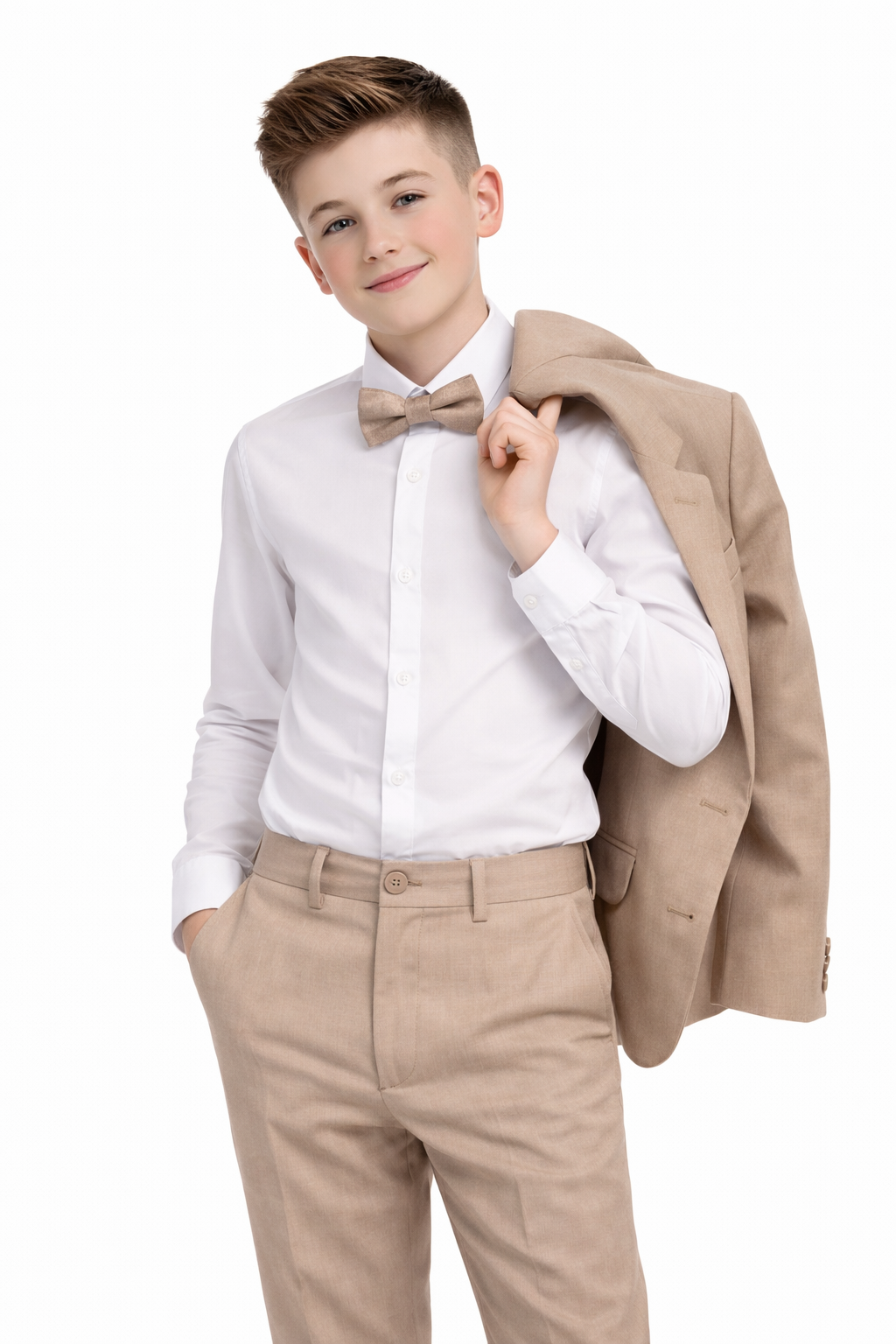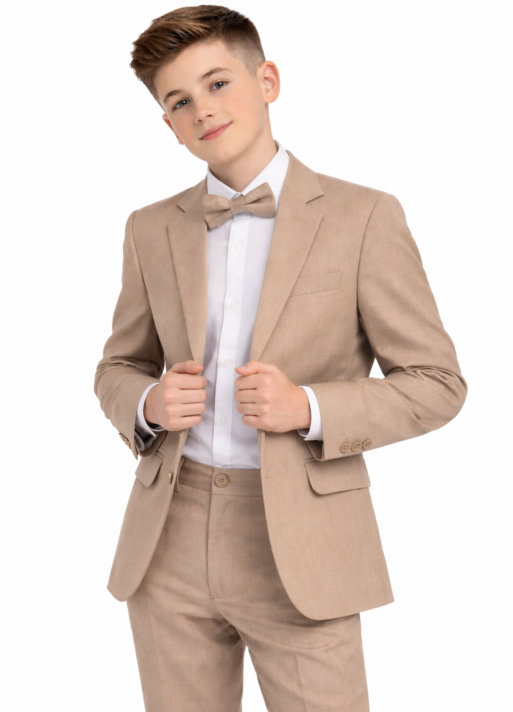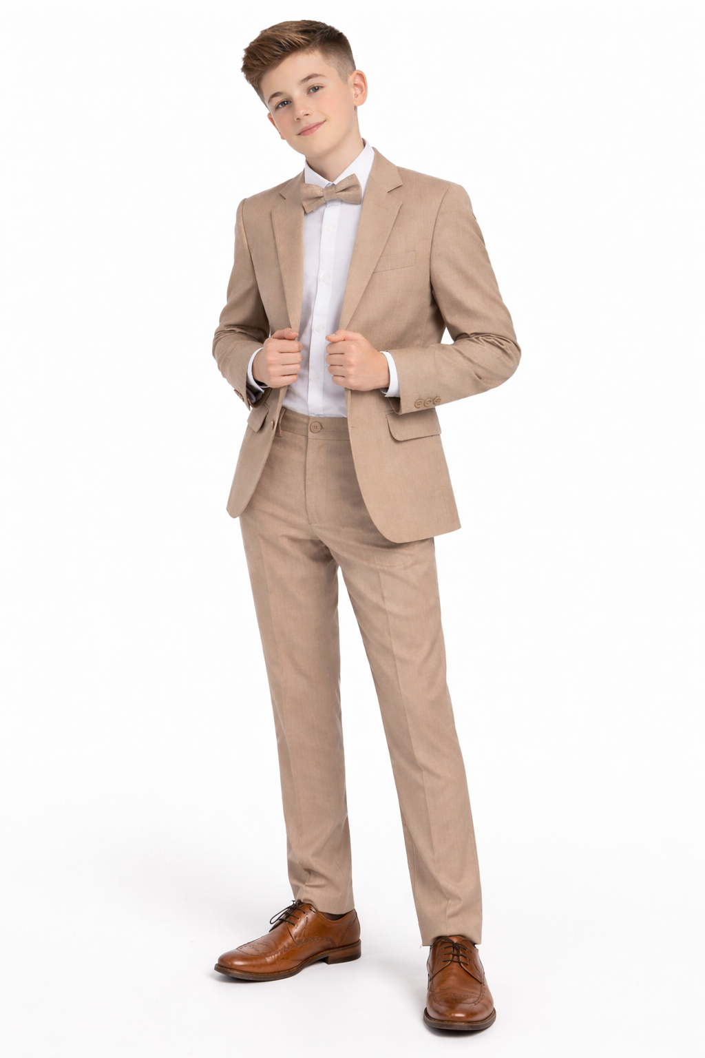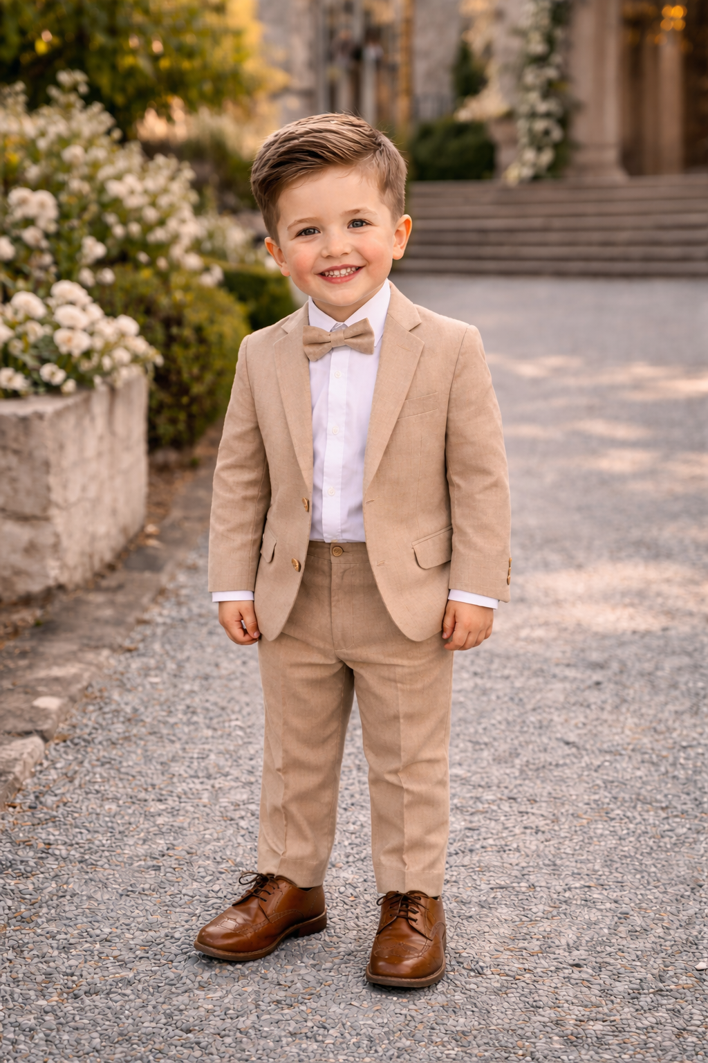 Dress him sharp for every special occasion with our boys’ light khaki bow tie suit – perfectly tailored, sleek, and comfortable enough for all-day wear. With smart details, it’s ideal for weddings, parties, school events, and formal photos. Timeless style, grown-up look, kid-friendly fit. Dress him in a tux that makes him feel confident and look unforgettable.