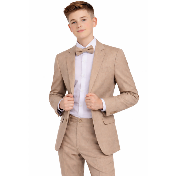 Dress him sharp for every special occasion with our boys’ light khaki bow tie suit – perfectly tailored, sleek, and comfortable enough for all-day wear. With smart details, it’s ideal for weddings, parties, school events, and formal photos. Timeless style, grown-up look, kid-friendly fit. Dress him in a tux that makes him feel confident and look unforgettable.