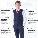 This suit consists of a fully lined navy waistcoat with an adjustable clasp for sizing, a white full sleeved collar shirt, navy elasticated trousers and a burgundy polka dot tie for that final touch