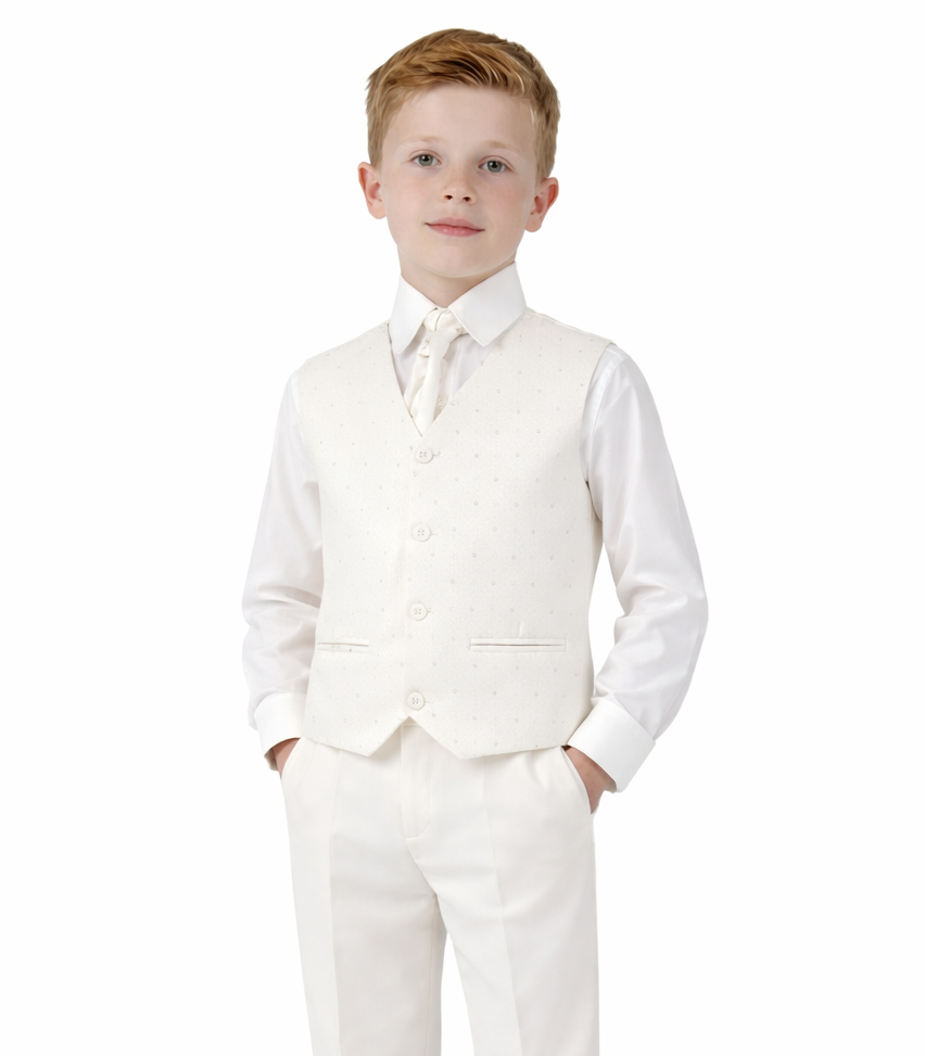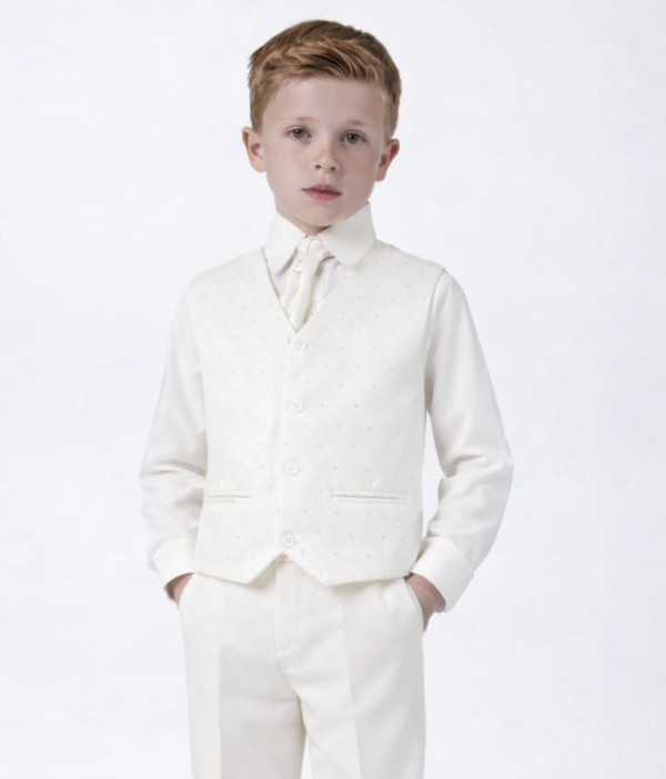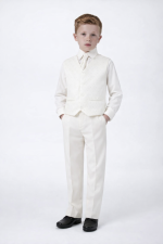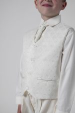 This 4 piece Vivaki suit comes with Cream trousers, a Cream shirt and a matching Cream dobby design cravat and waistcoat. This lovely 4 piece suit is perfect for a wedding, page boy, christening, first holy communion, school prom, party or any other Special occasion. These suits have a comfortable and high quality feel to them.