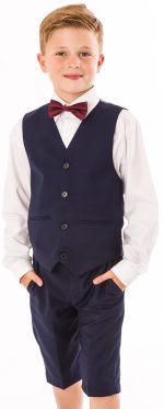The suit made from high quality, light weight fabric consists of a full sleeve white collar shirt, elasticated shorts, a 4 buttoned waistcoat and a Wine satin finished bow tie to seal off this stunning suit.