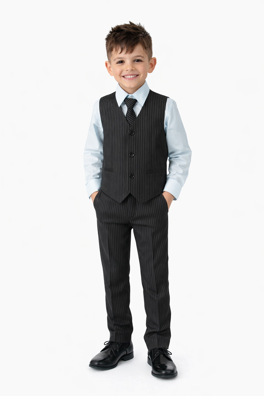 The suit consists of a full sleeve, collar shirt, elasticated trousers, and a waistcoat with a simple satin finish and 3 buttons and a matching tie to finish the look.