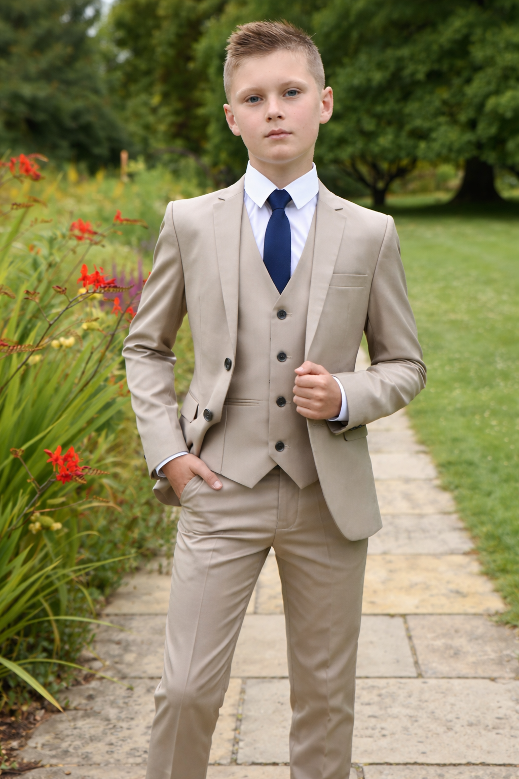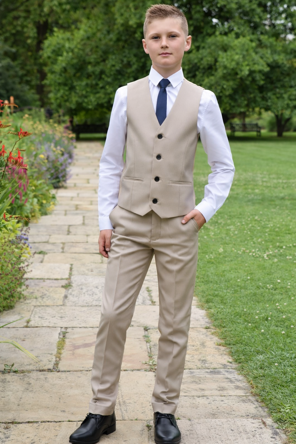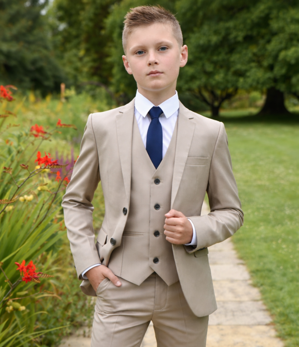 A premium luxury suit by designers Milano mayfair. This complete 5 piece slim fit suit comes with a 2 Button Jacket, trousers with adjustable waist, matching 4 button waistcoat, crisp white shirt and a tie to complement the suit. Make your little gent look stunning and make every moment memorable with this suit.