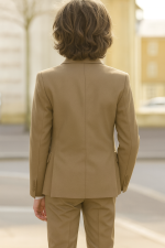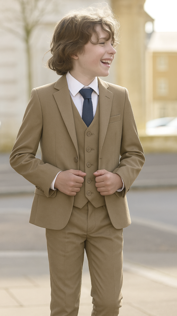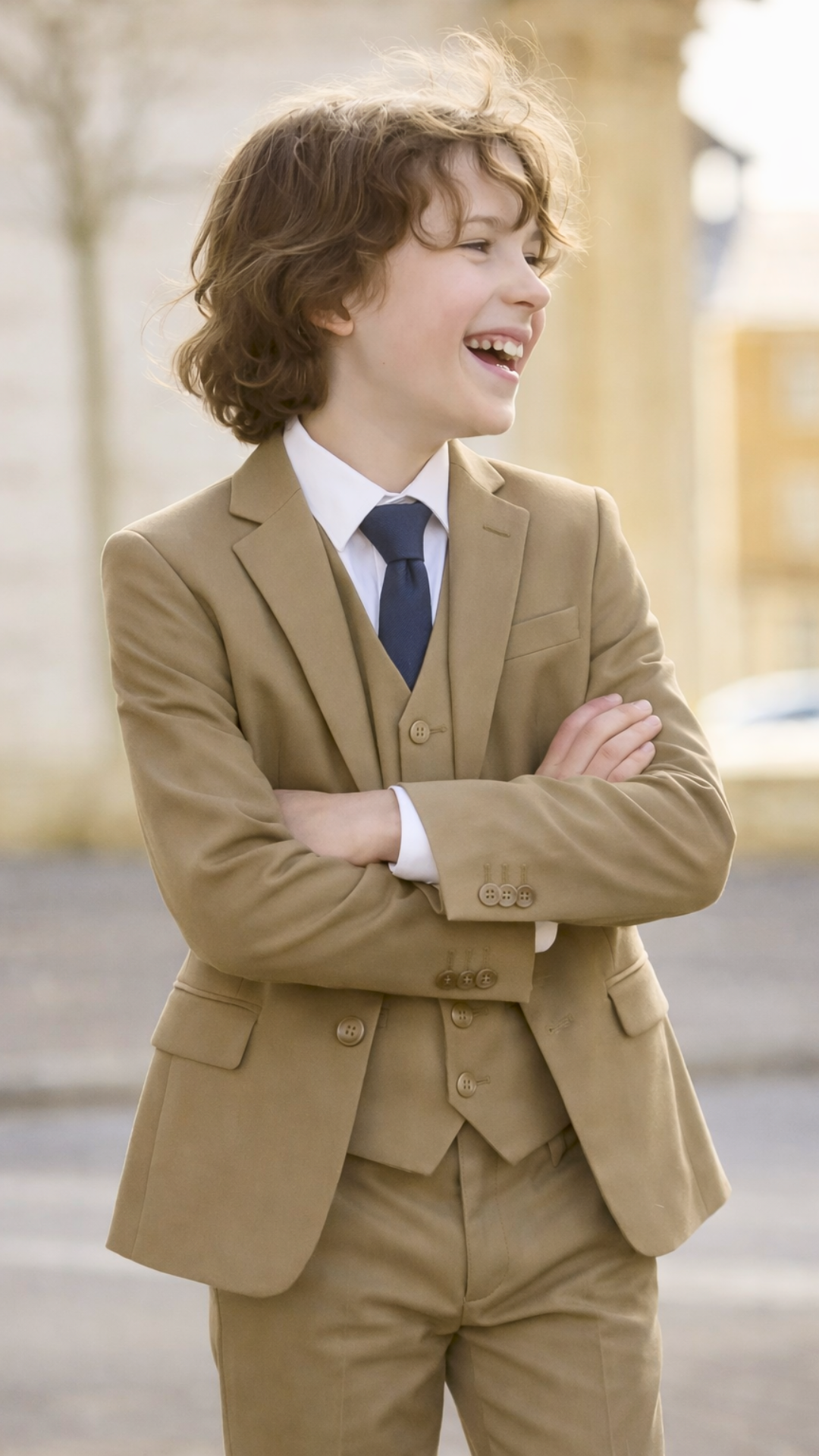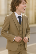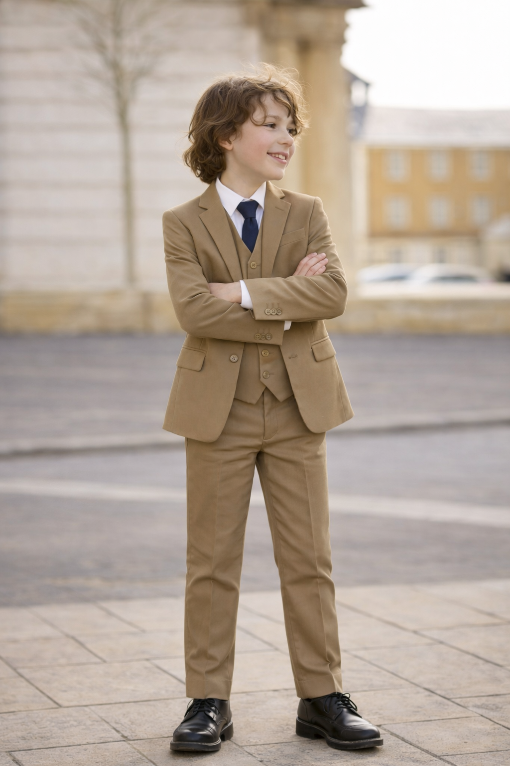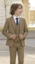 A premium luxury suit by designers Vivaki. This complete 5 piece slim fit suit comes with a 2 Button Jacket, trousers with adjustable waist, matching 4 button waistcoat, crisp white shirt and a tie to complement the suit. Make your little gent look stunning and make every moment memorable with this suit.