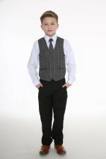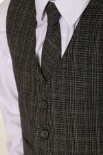 This Stylish Black suit is incredibly eye catching with its Chequered Waistcoat and matching tie. The design of the waistcoat has various lines of White and Grey which makes this waistcoat the dominant piece of the suit. Subtle hints of grey running throughout the pattern compliment the black jacket and trousers. The whole suit is finished off with a crisp white shirt