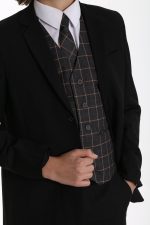 This Stylish black suit is incredibly eye catching with its Chequered Waistcoat and matching tie. The design of the waistcoat has various lines of White and Grey which makes this waistcoat the dominant piece of the suit. Subtle hints of grey running throughout the pattern compliment the black jacket and trousers. The whole suit is finished off with a crisp white shirt