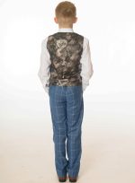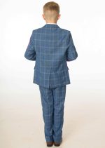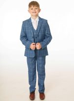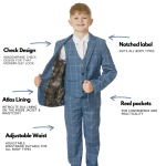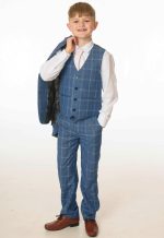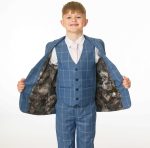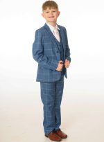 Lockdown the look in this super stylish boys 5 piece blue check suit. The crisp white shirt and light pink tie contrast flawlessly with the bright blue suit colouring creating the perfect stand out outfit.