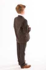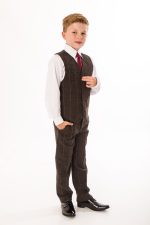 This wonderfully styled suit is the perfect suit for those looking for a tweed suit. This check style suit is a 5 piece suit and comes with a finely crafted tweed blazer and waistcoat, tweed trousers, a white shirt and a red tie to finish off this smart look. Well stitched and high quality material. The suit includes a beautifully stitched detailed pocket to finish the look of a fine tailored boys suit. Perfect for any formal occasion or wedding to make your little boy stand out with class and elegance.