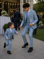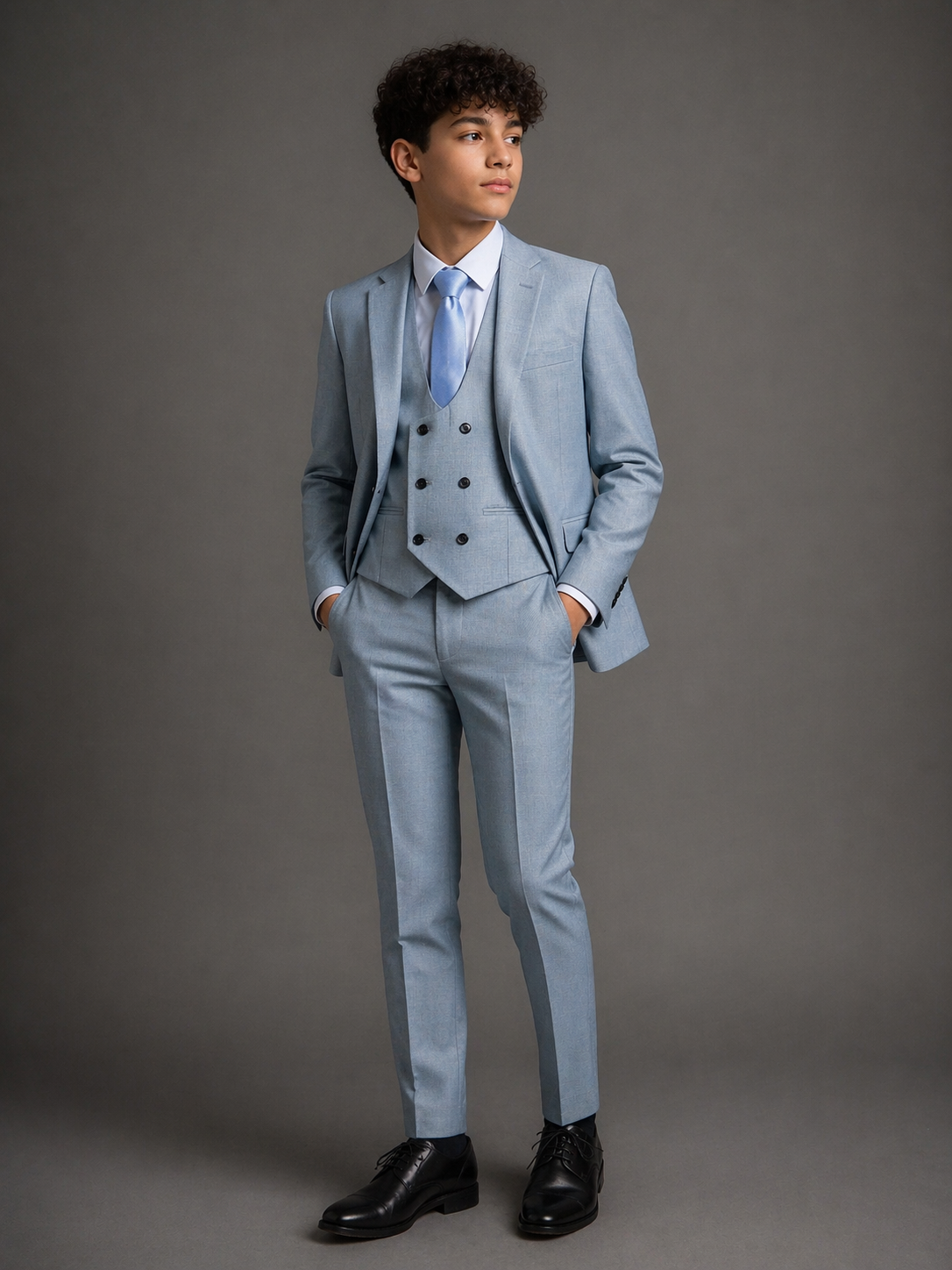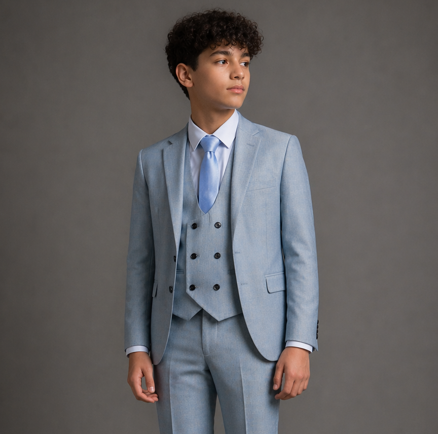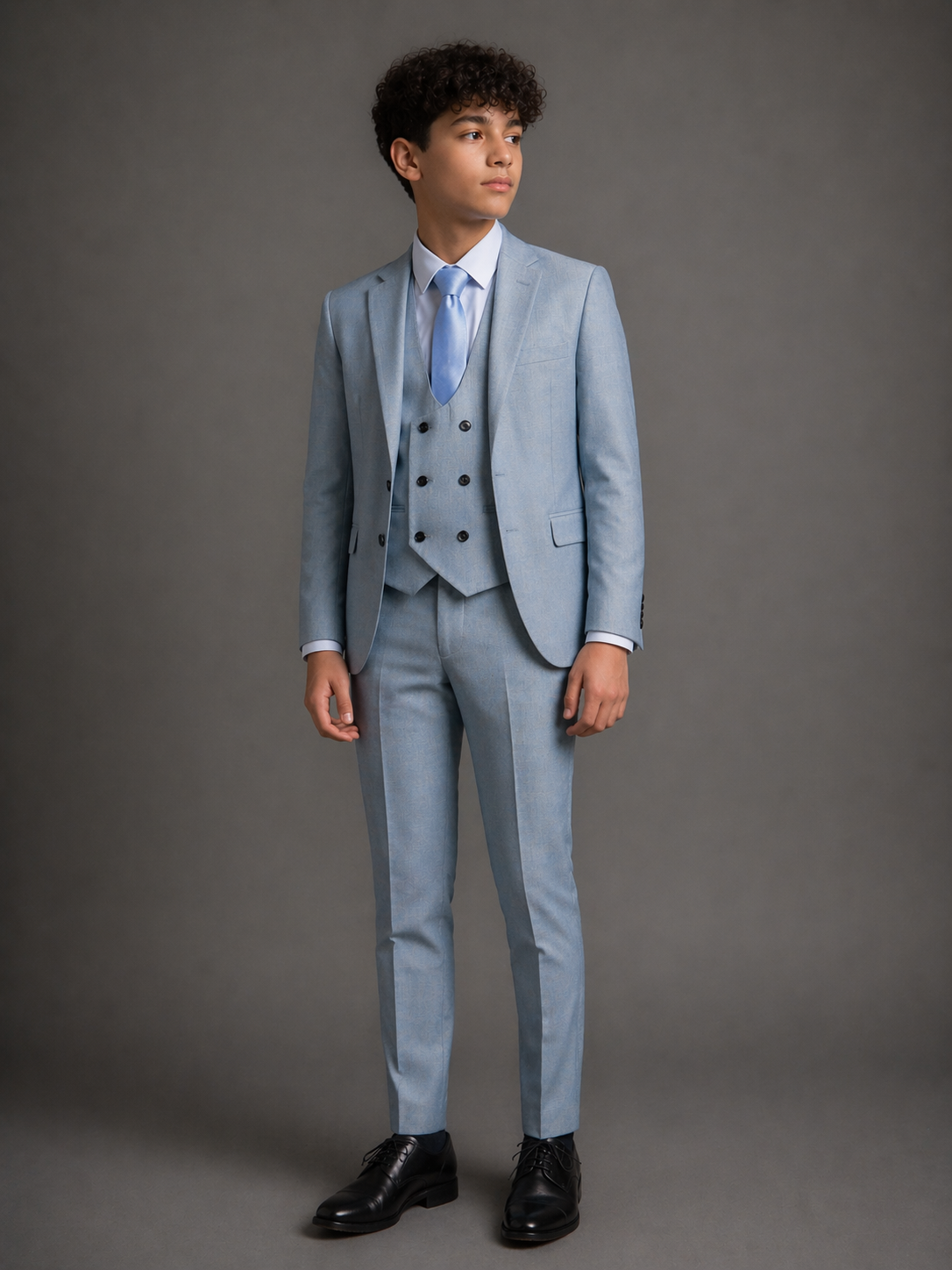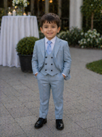 The most perfect summer suit, a premium luxury outfit by designers Milano Mayfair. This complete 5 piece slim fit suit comes with a 2 Button Jacket, trousers with adjustable waist, matching 4 button waistcoat, crisp white shirt and a tie to complement the suit. Make your little gent look stunning and make every moment memorable with this suit. This premium suit comes in a Milano Mayfair suit bag.