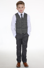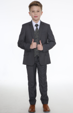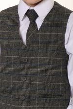 This Stylish Grey suit is incredibly eye catching with its Chequered Waistcoat and matching tie. The design of the waistcoat has various lines of White and Grey which makes this waistcoat the dominant piece of the suit. Subtle hints of blue running throughout the pattern compliment the grey jacket and trousers. The whole suit is finished off with a crisp white shirt