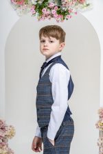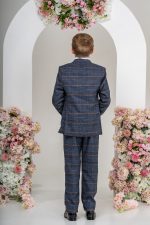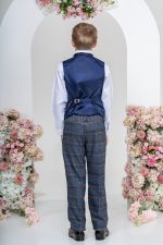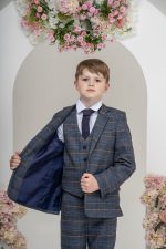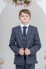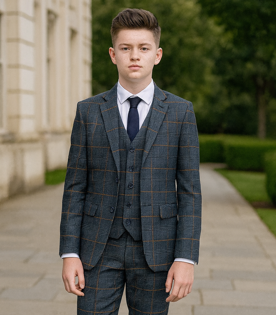 - Waistcoat: Matching blue with orange check waistcoat to tie the outfit together.