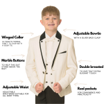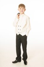 This boys full 5 piece suit comes complete with jacket, shirt, waistcoat, trousers and bow tie