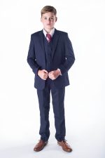 This suit is complete with a slick 2 button navy suit jacket, a matching fully lined navy waistcoat with an adjustable clasp for sizing, a white full sleeved collar shirt, navy elasticated trousers and a plain burgundy tie for that final touch