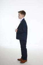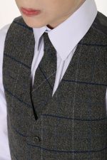 This Stylish Navy suit is incredibly eye catching with its Chequered Waistcoat and matching tie. The design of the waistcoat has various lines of White and Grey which makes this waistcoat the dominant piece of the suit. Subtle hints of blue running throughout the pattern compliment the navy jacket and trousers. The whole suit is finished off with a crisp white shirt